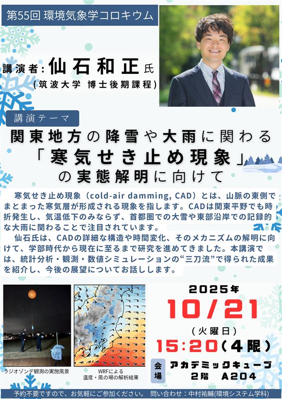 演題:「関東地方の降雪や大雨に関わる『寒気せき止め現象』の実態解明に向けて」