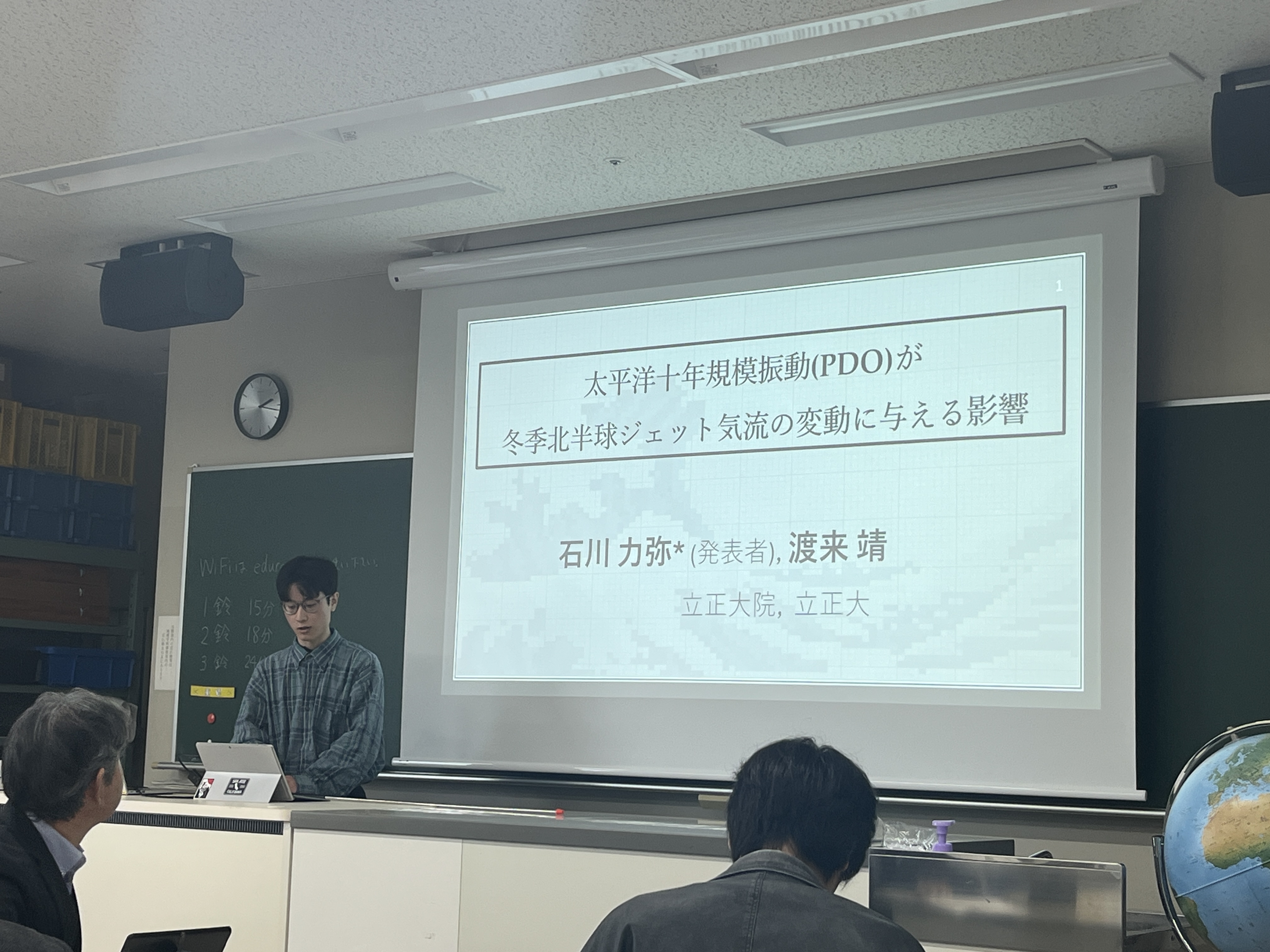 発表題目は「太平洋十年規模振動が冬季北半球ジェット気流の変動に与える影響」 太平洋十年規模振動(PDO)と冬季ジェット気流の変動との関係について、統計解析を中心とした研究成果を報告しました。