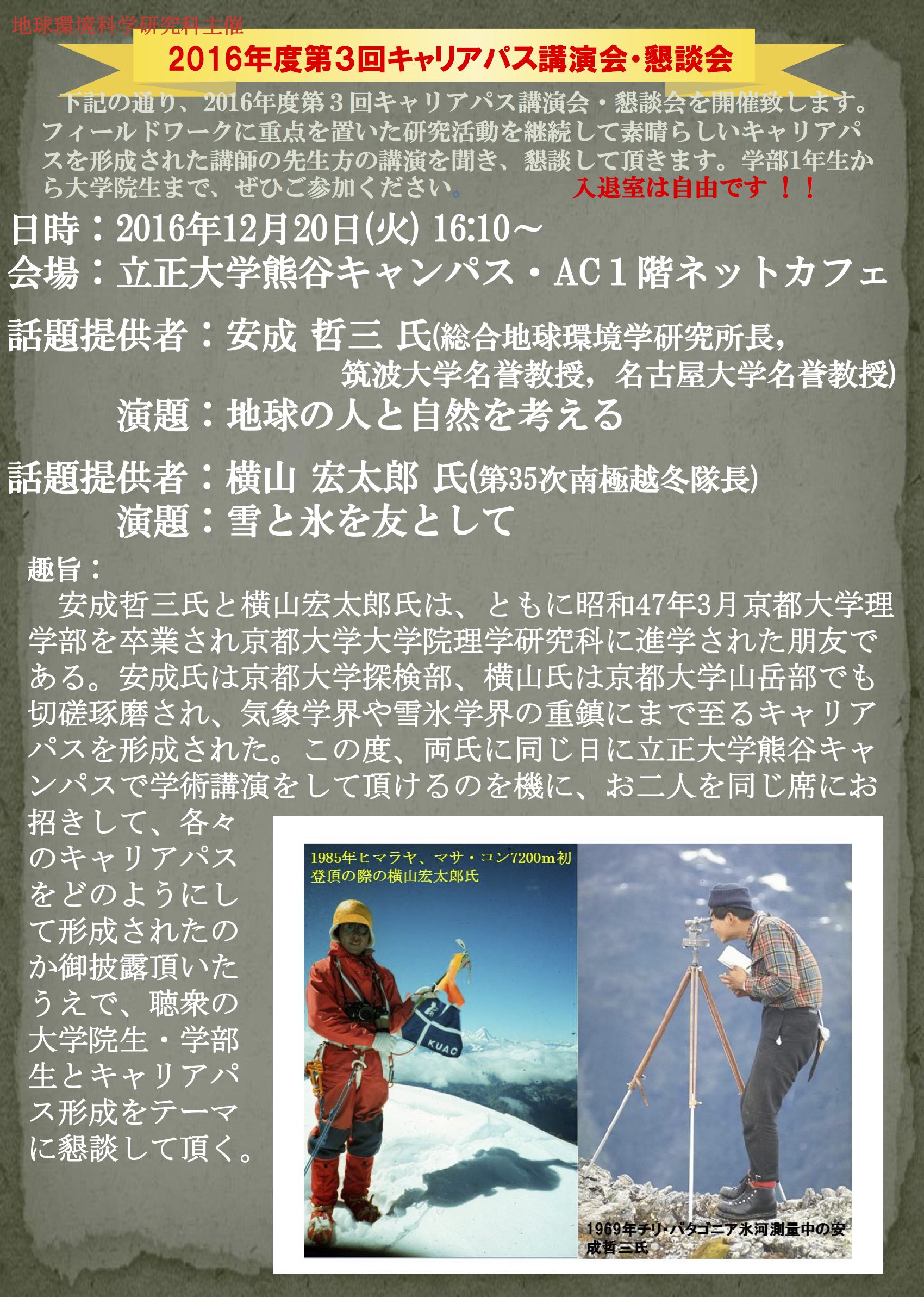 環境気象学分野では、下記の通り特別講演会とキャリアパス懇談会を開催いたします。 今回お招きするのは、安成哲三氏(総合地球環境学研究所長)と横山宏太郎氏(第35次南極越冬隊長)です。お二人とも、まさに「フィールドは全世界!」を体現してきた方々です。世界を相手に活躍されてきたお二方のお話は、exciting & motivating になること必至です。気象・気候学に興味のある方はもちろん、学部生から大学院生まで、幅広い参加をお待ちしています。