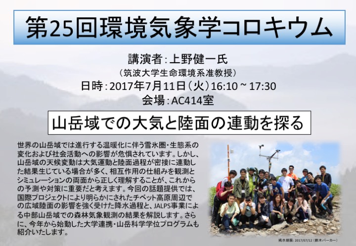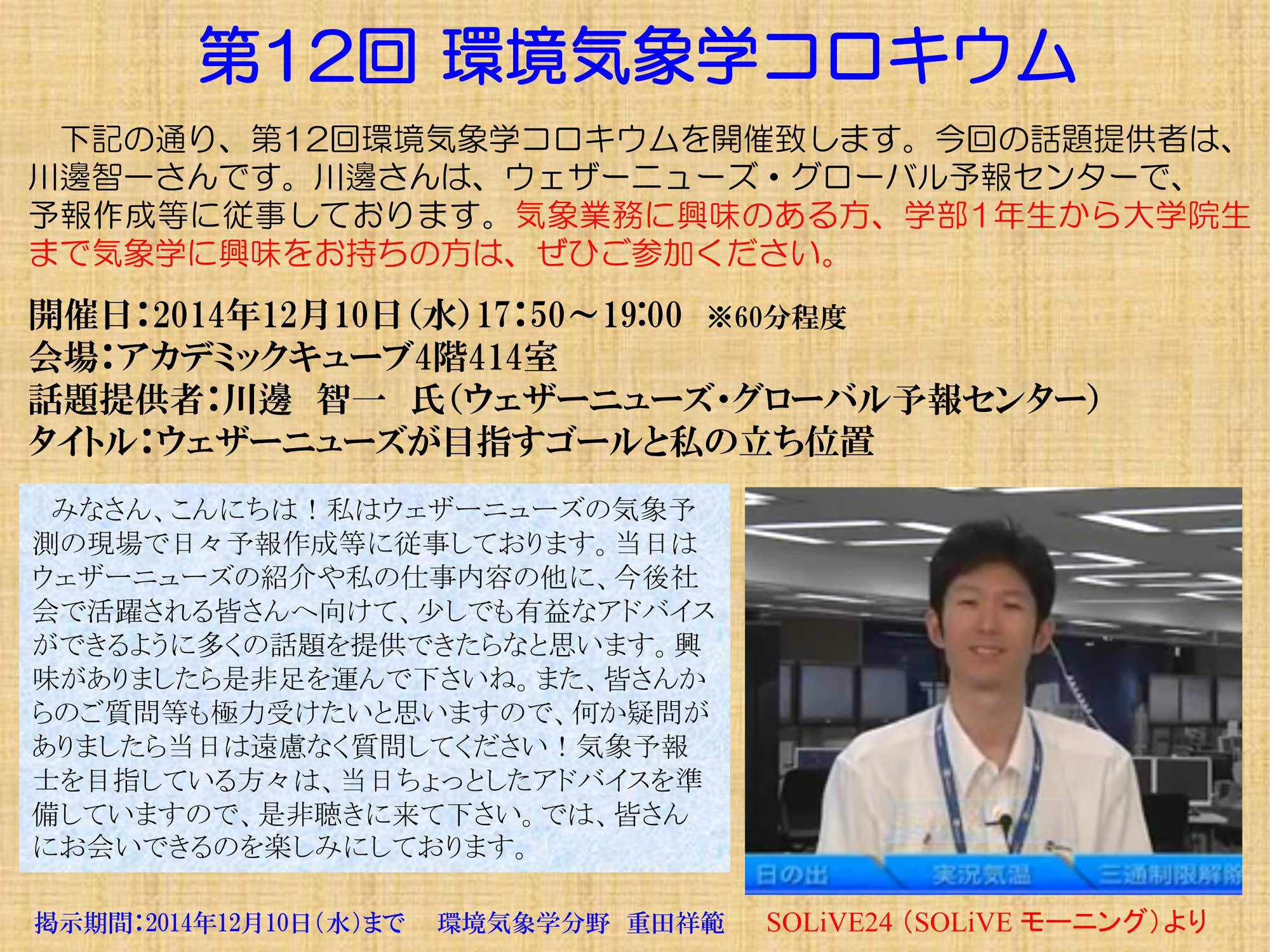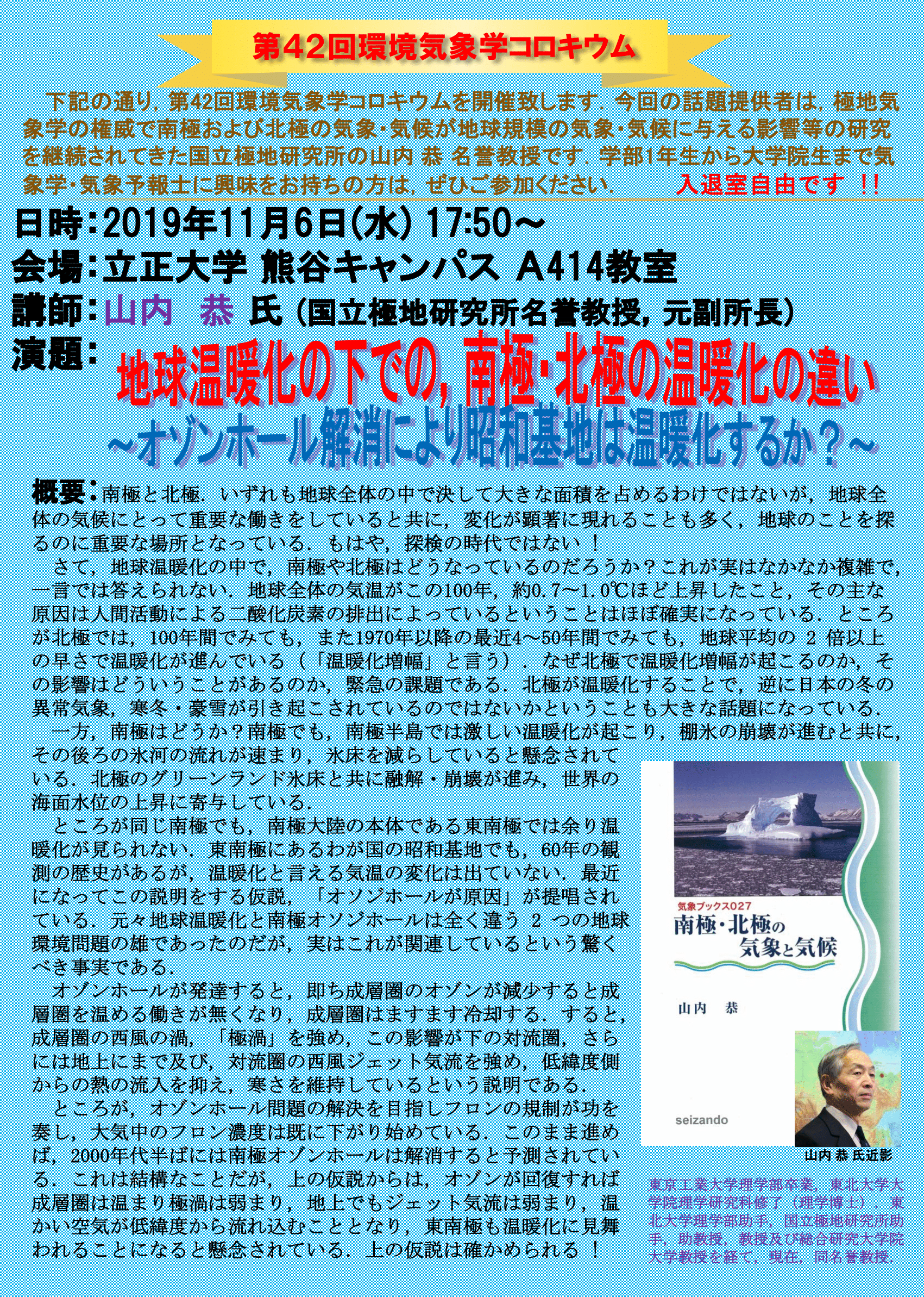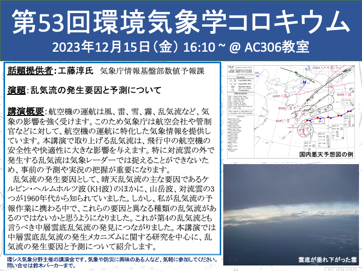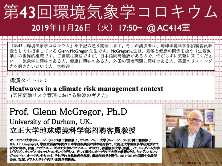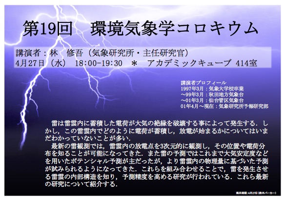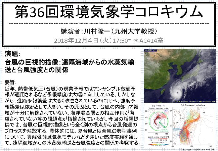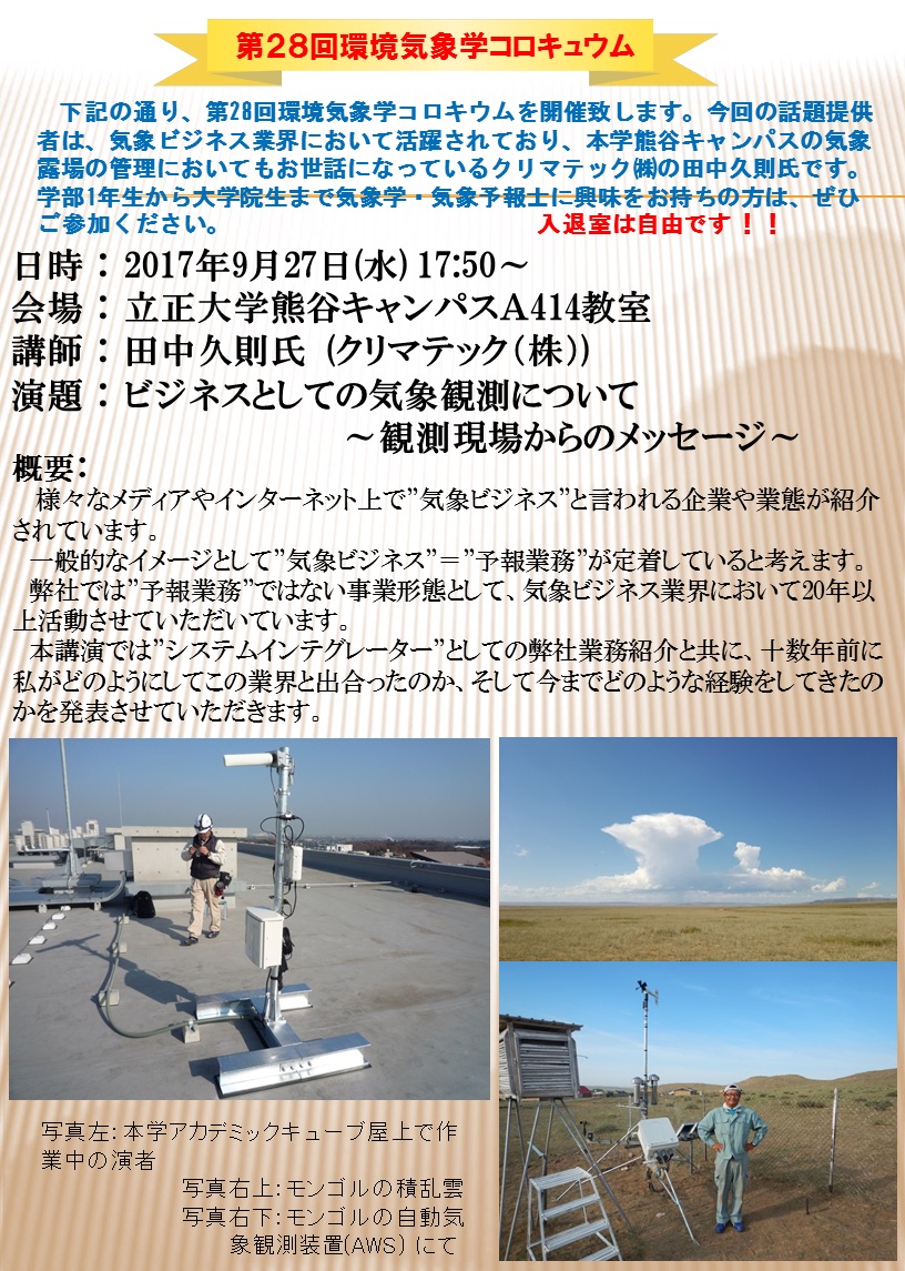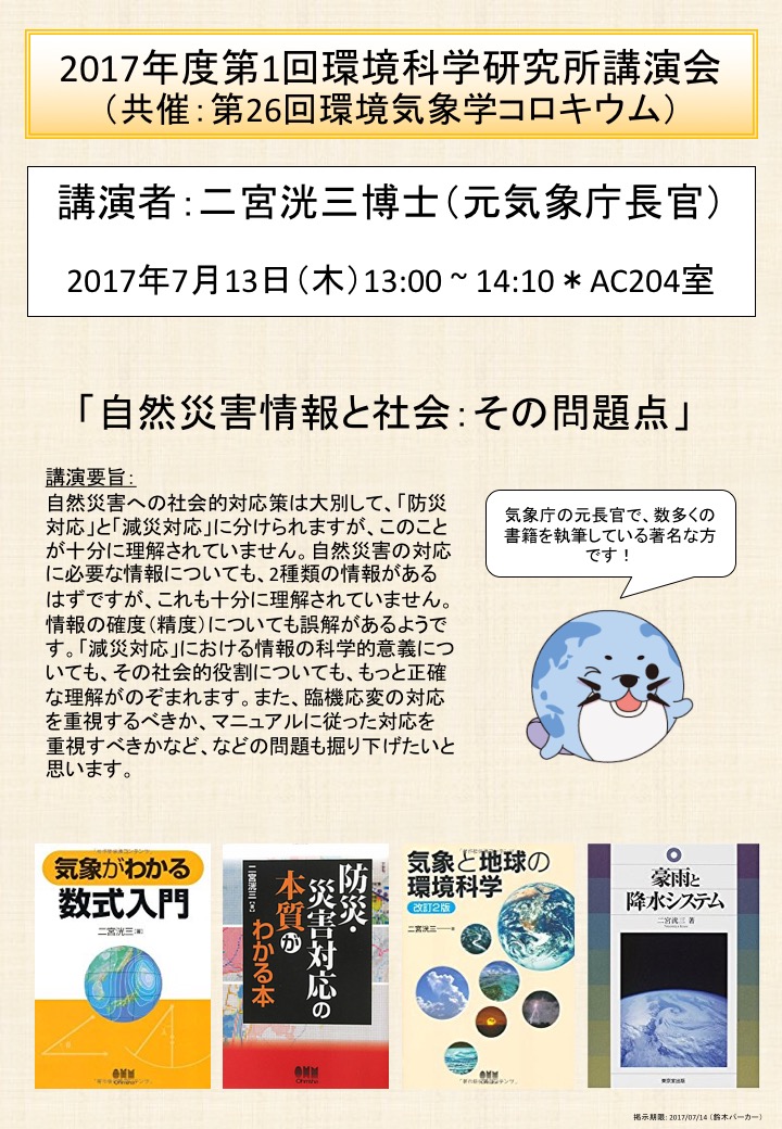 本学地球環境科学研究所(大学院の機関)が、元気象庁長官の二宮氏をお招きして講演会を開催します。本講演会は、第26回環境気象学コロキウムとして共催されます。学部のみなさんも積極的に参加してください。