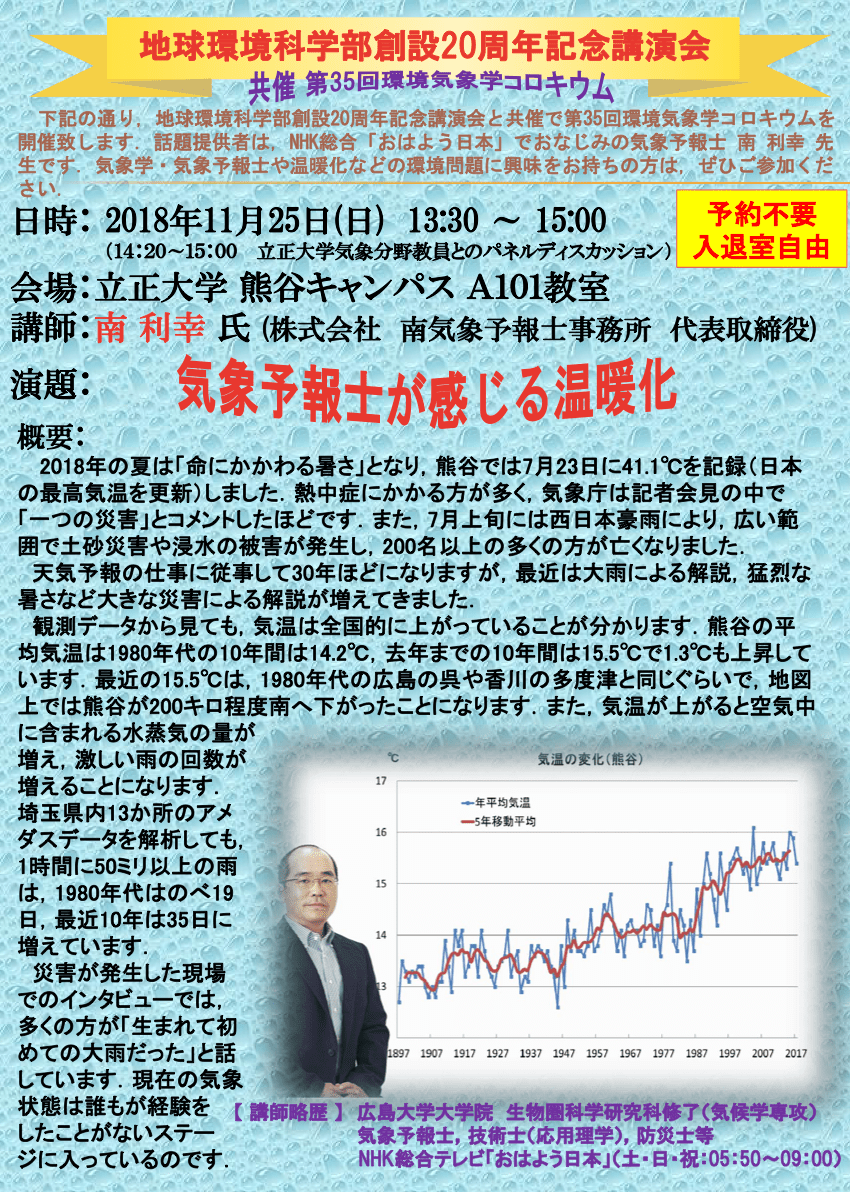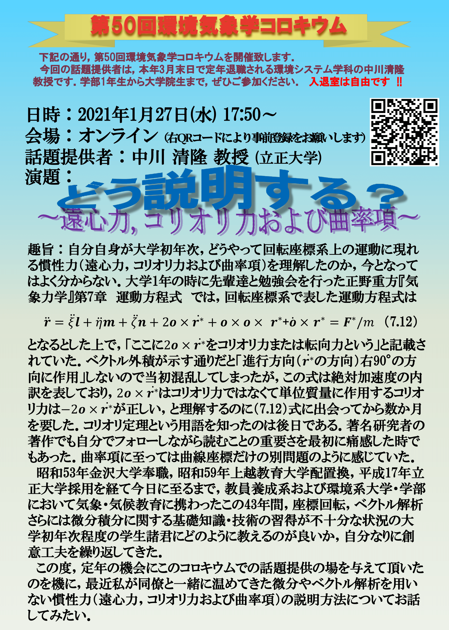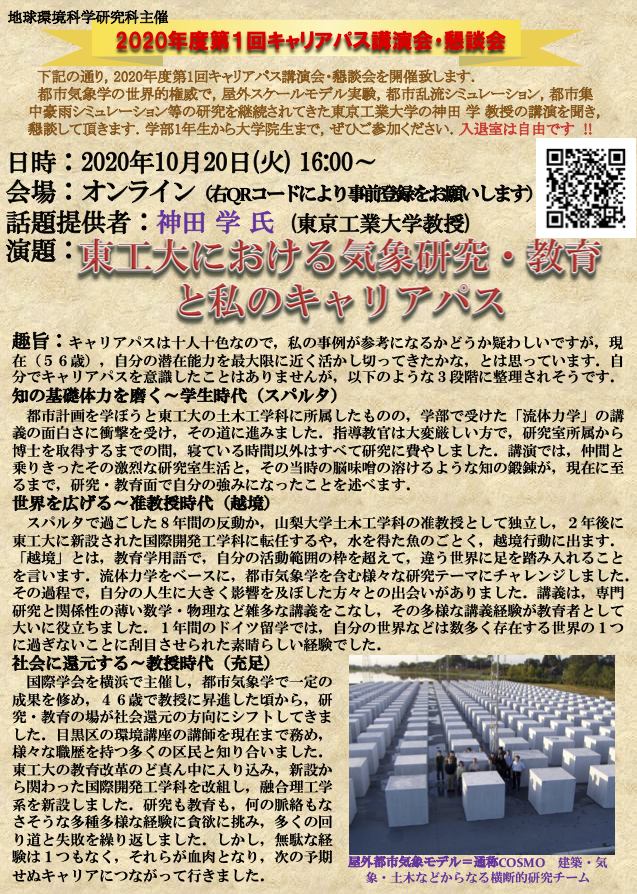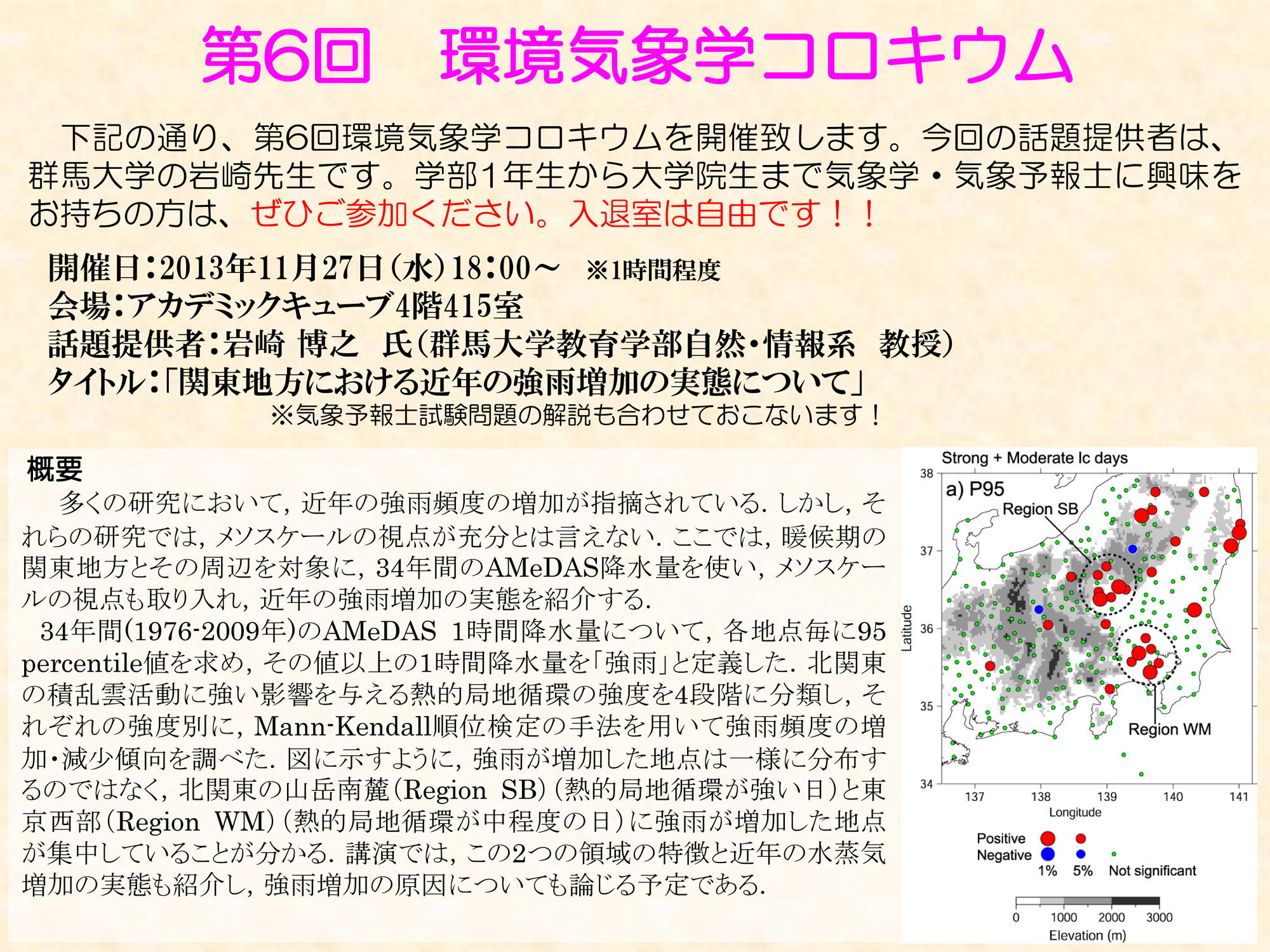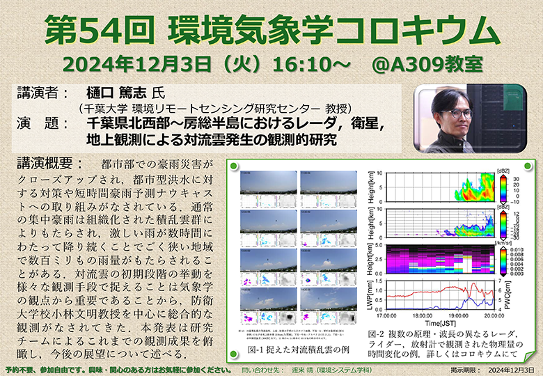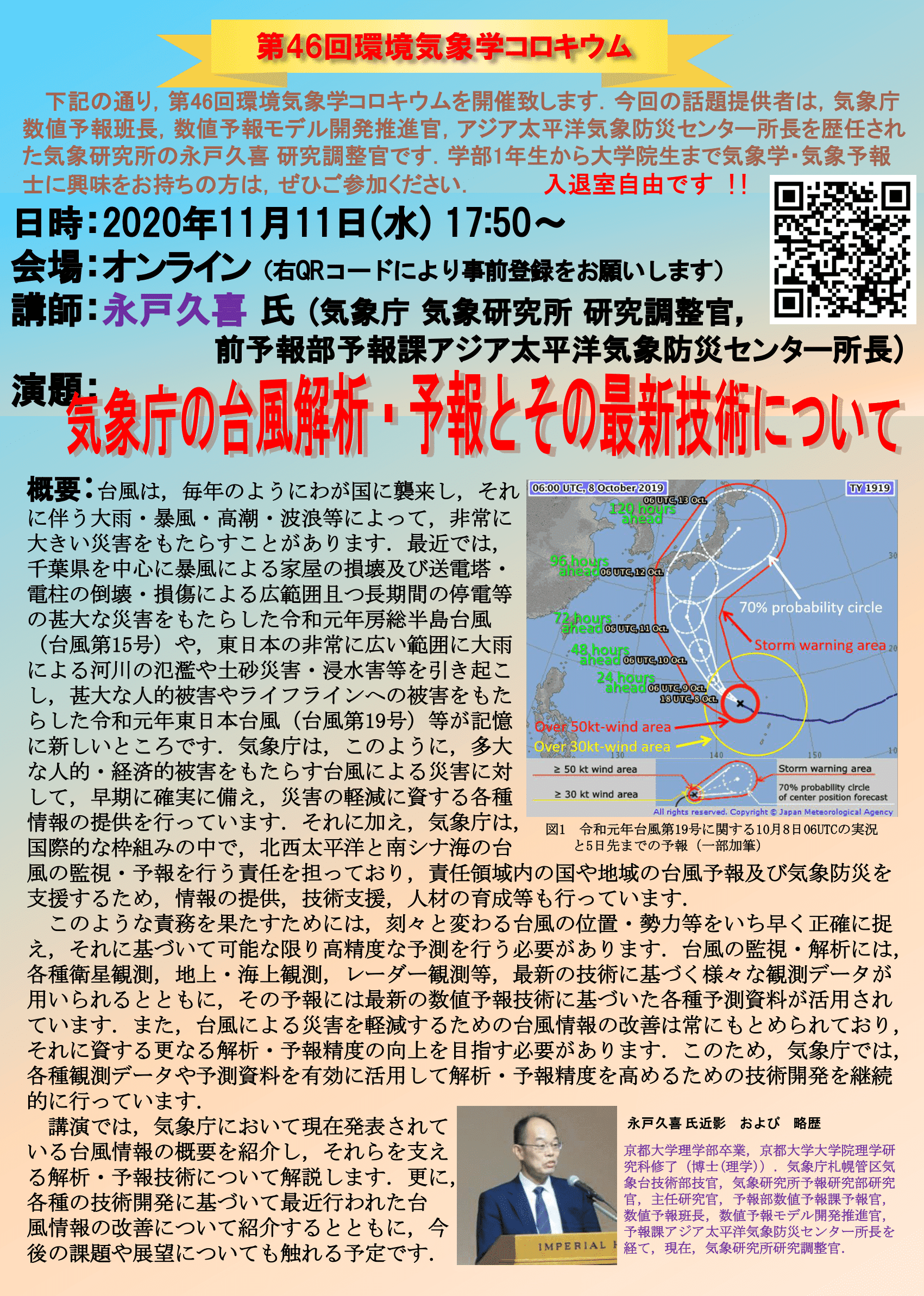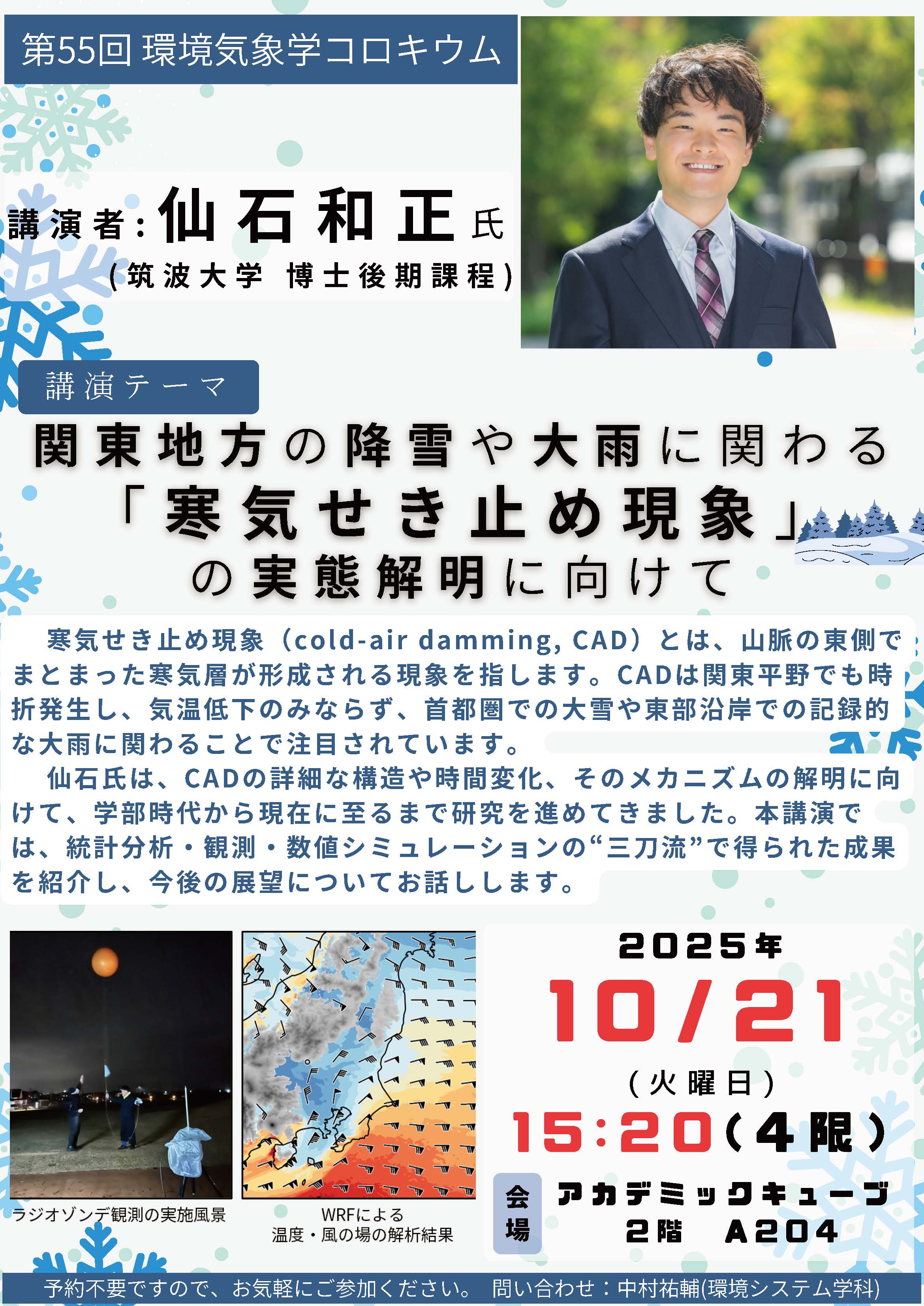 本学地球環境科学研究所(大学院の機関)が、元気象庁長官の二宮氏をお招きして講演会を開催します。本講演会は、第26回環境気象学コロキウムとして共催されます。学部のみなさんも積極的に参加してください。