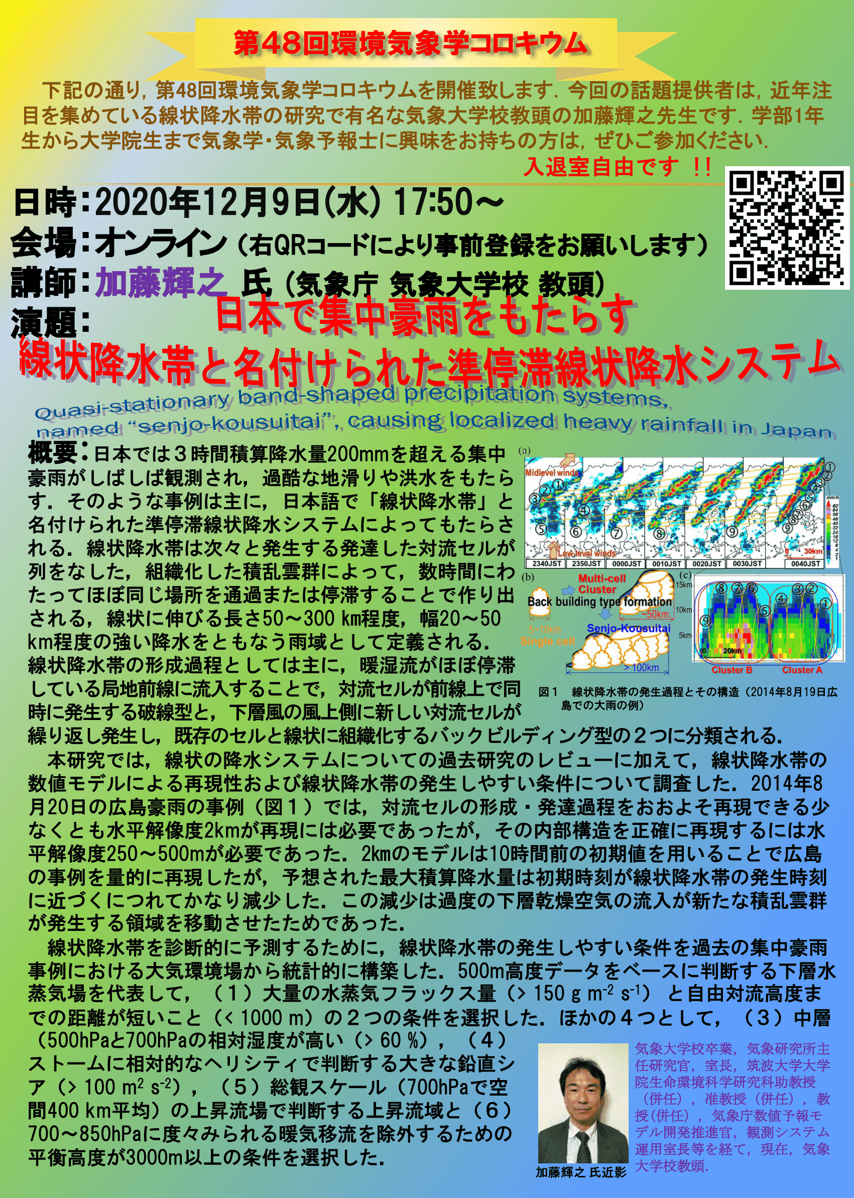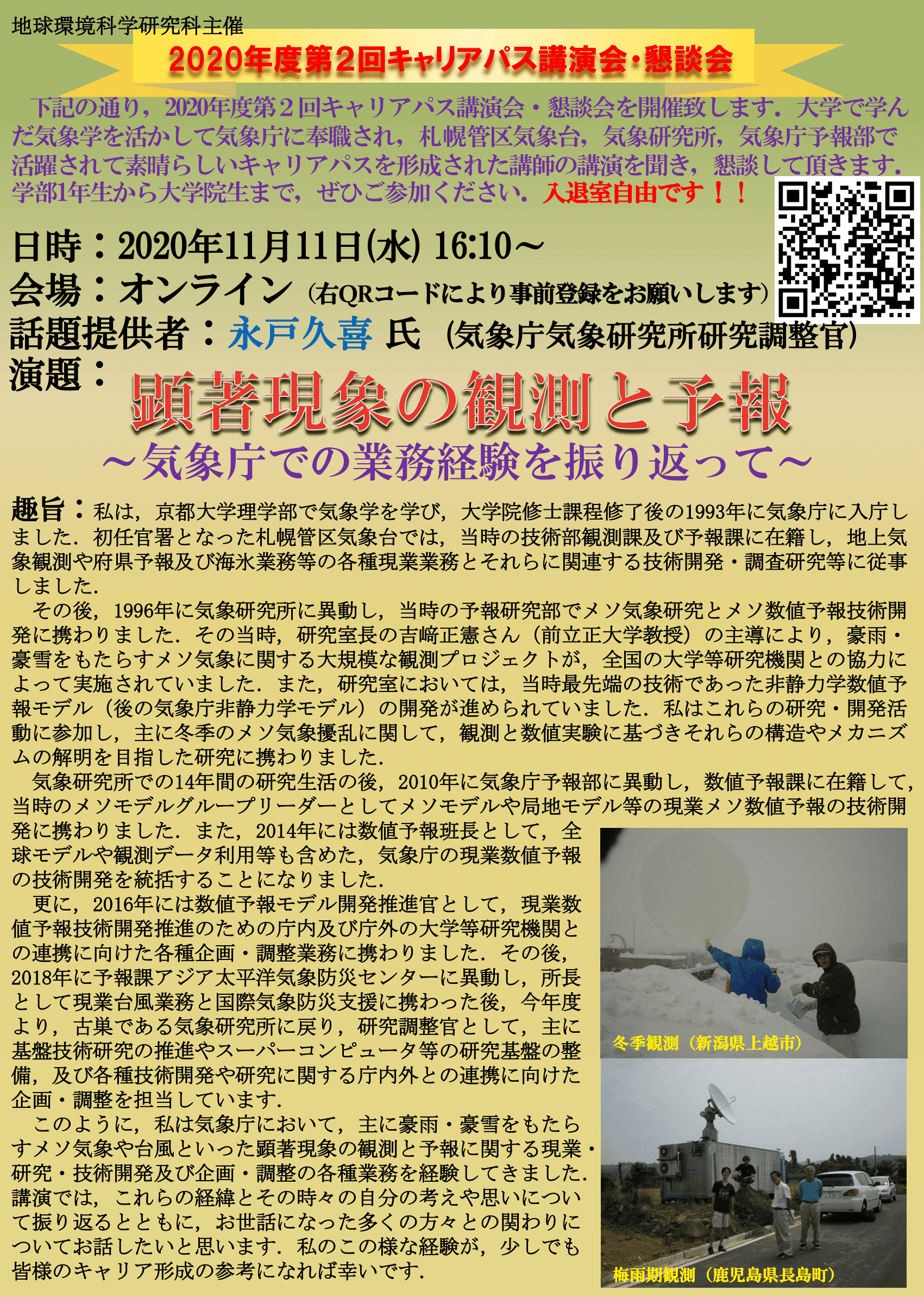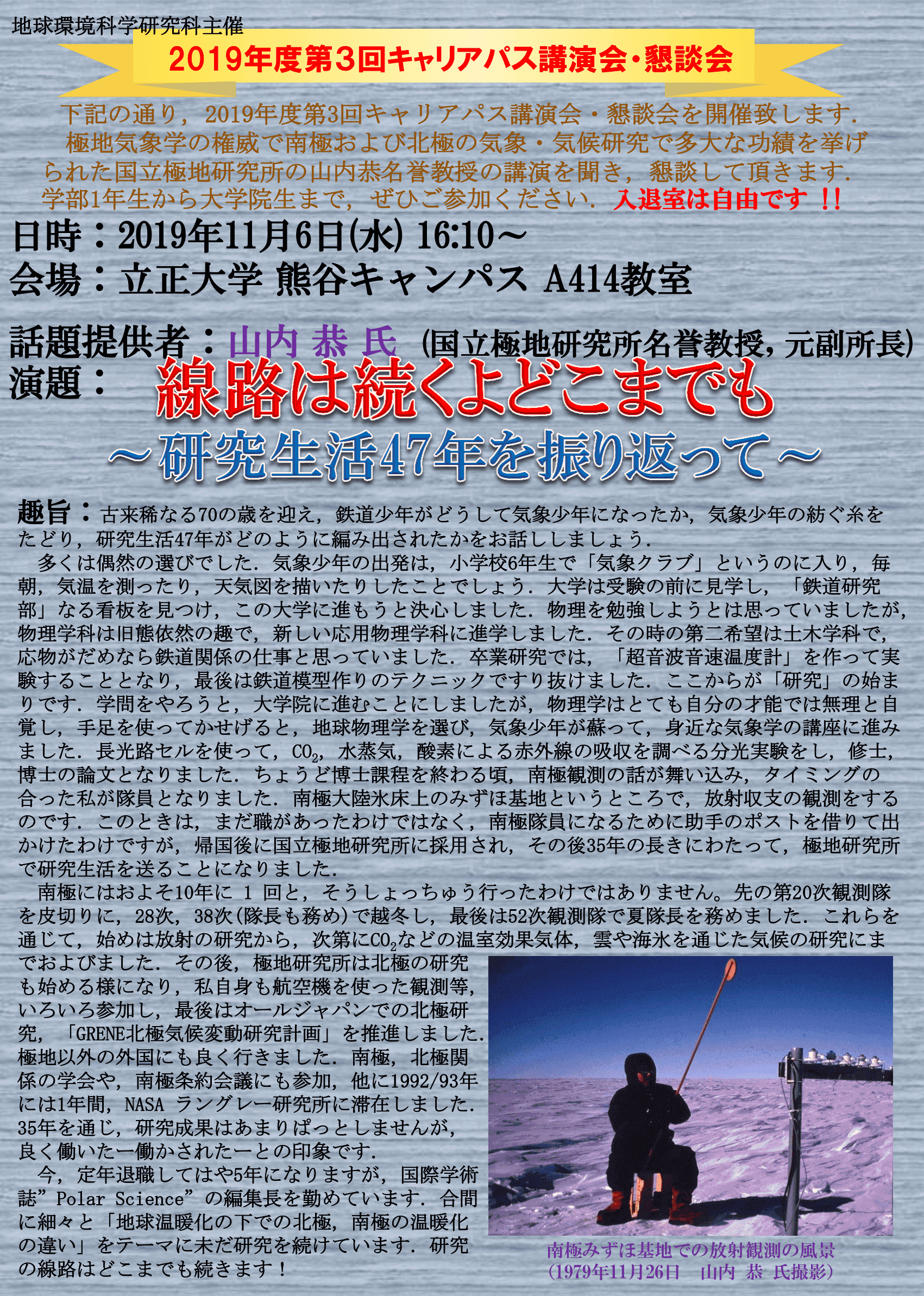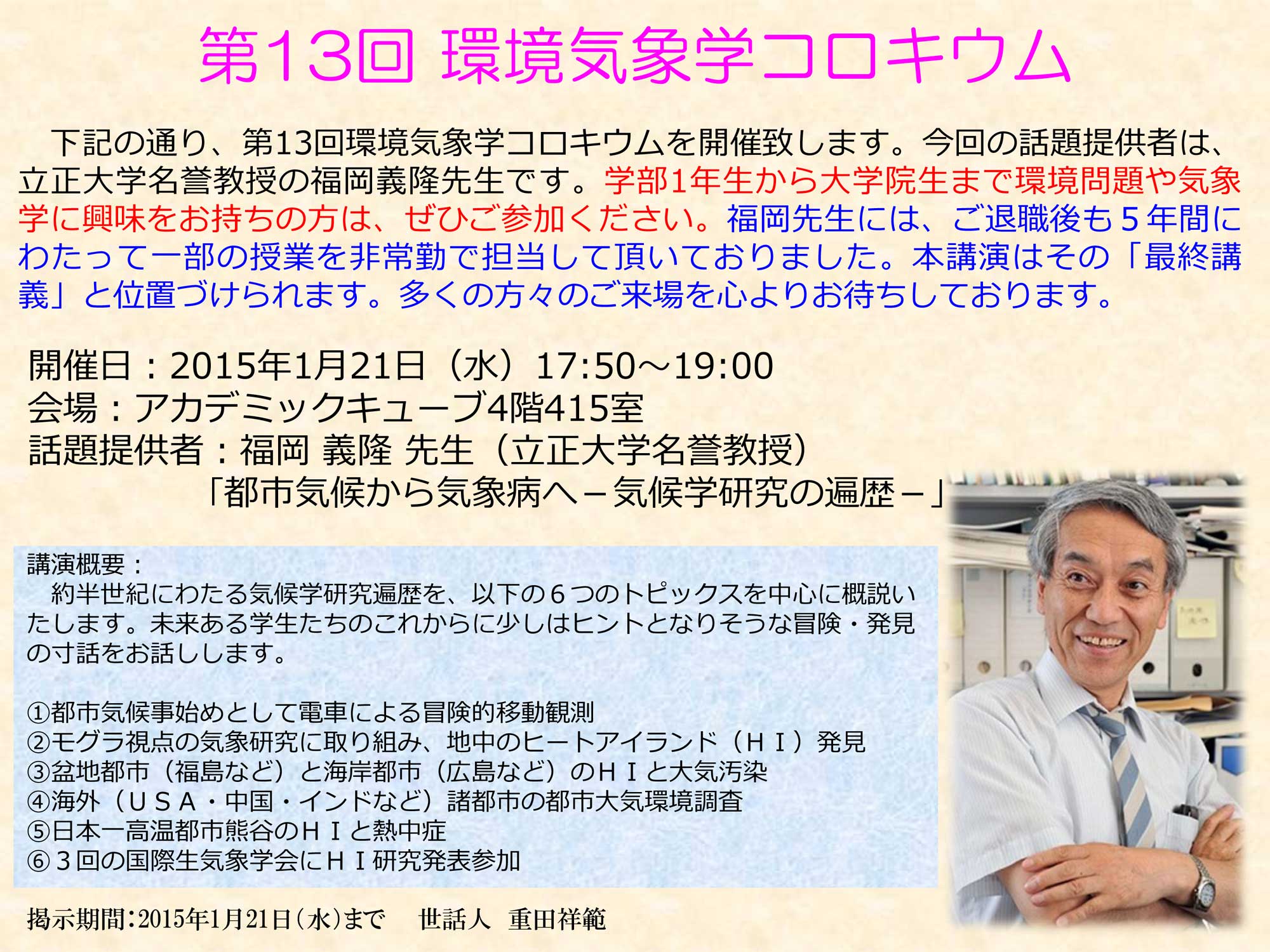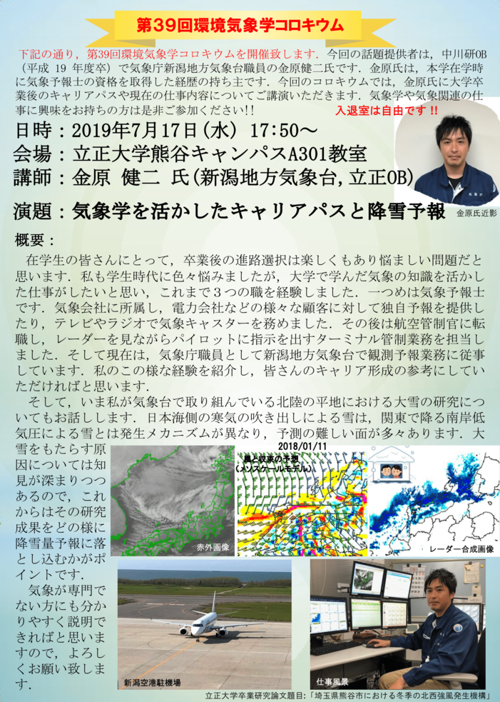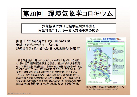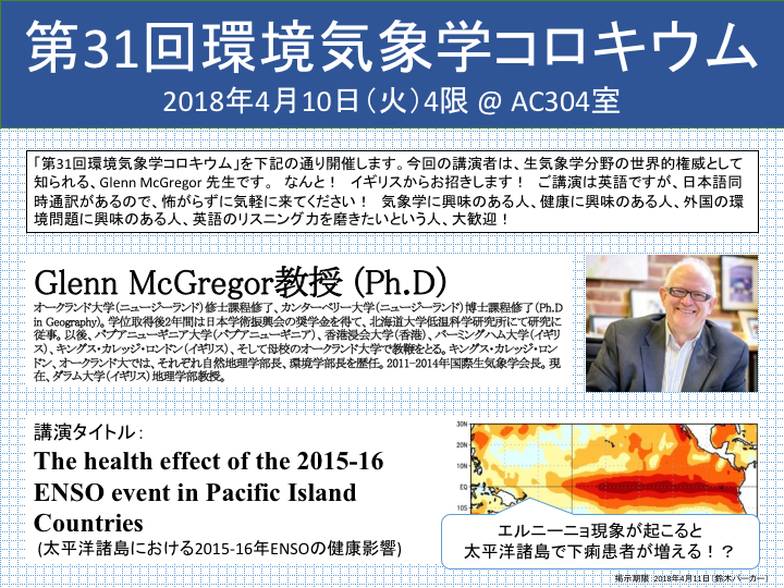 本学地球環境科学研究所(大学院の機関)が、元気象庁長官の二宮氏をお招きして講演会を開催します。本講演会は、第26回環境気象学コロキウムとして共催されます。学部のみなさんも積極的に参加してください。