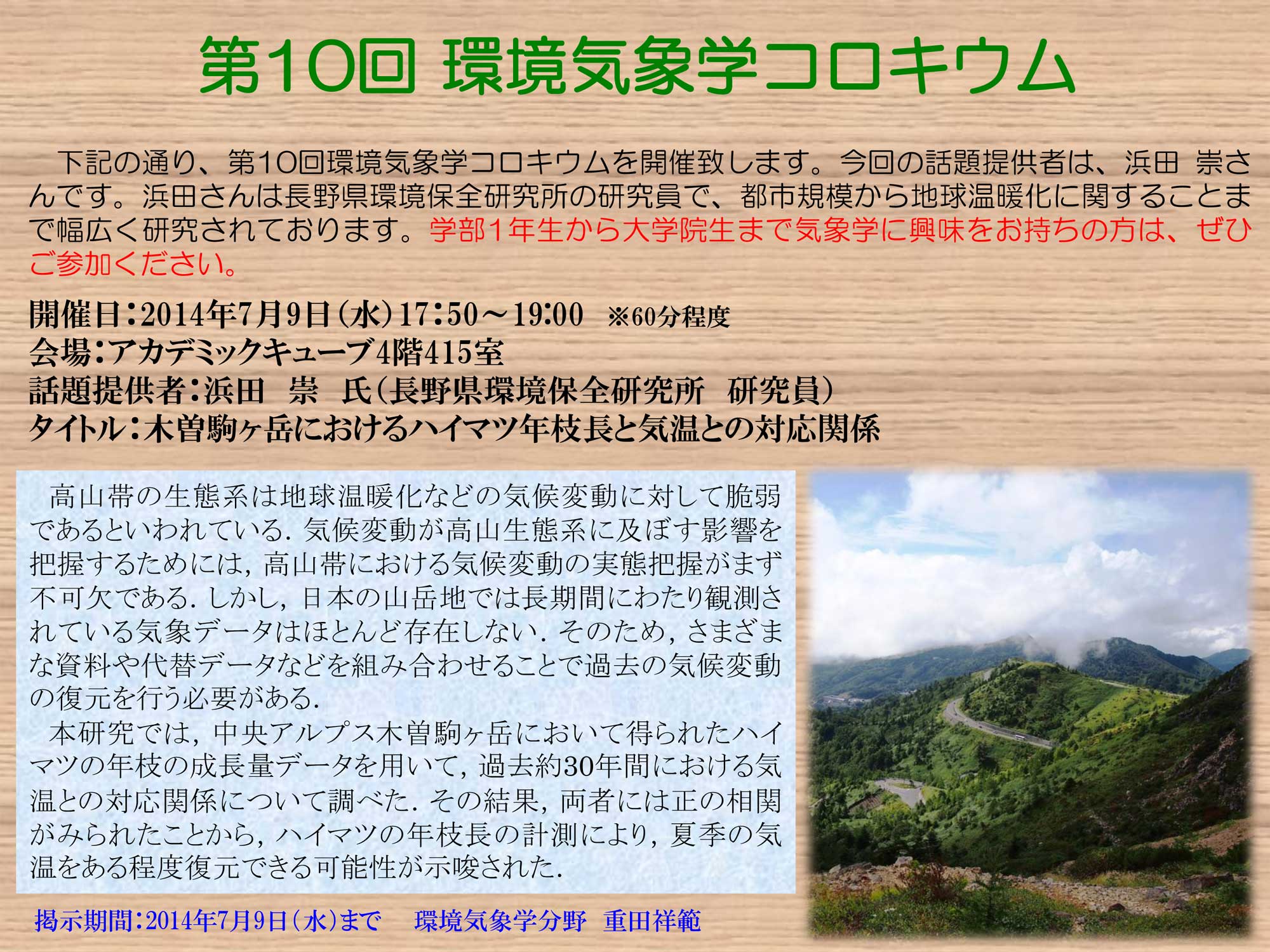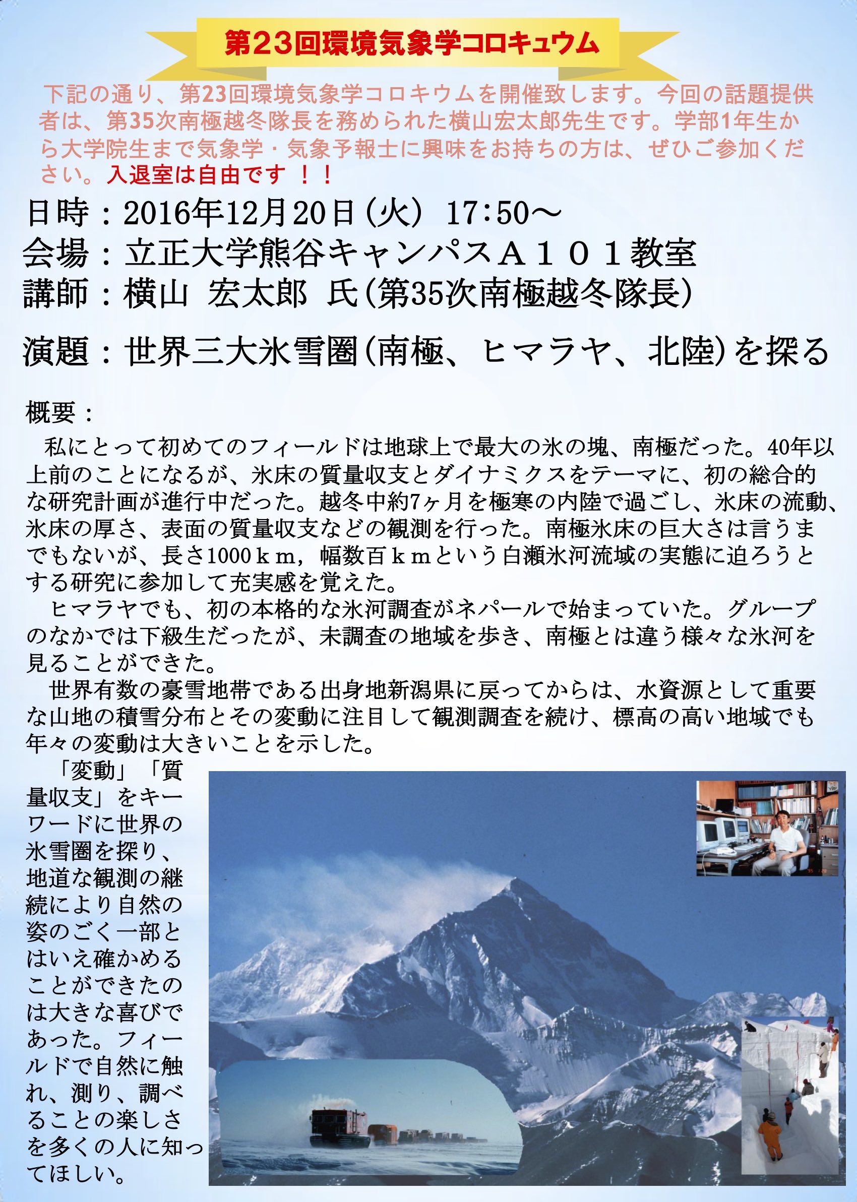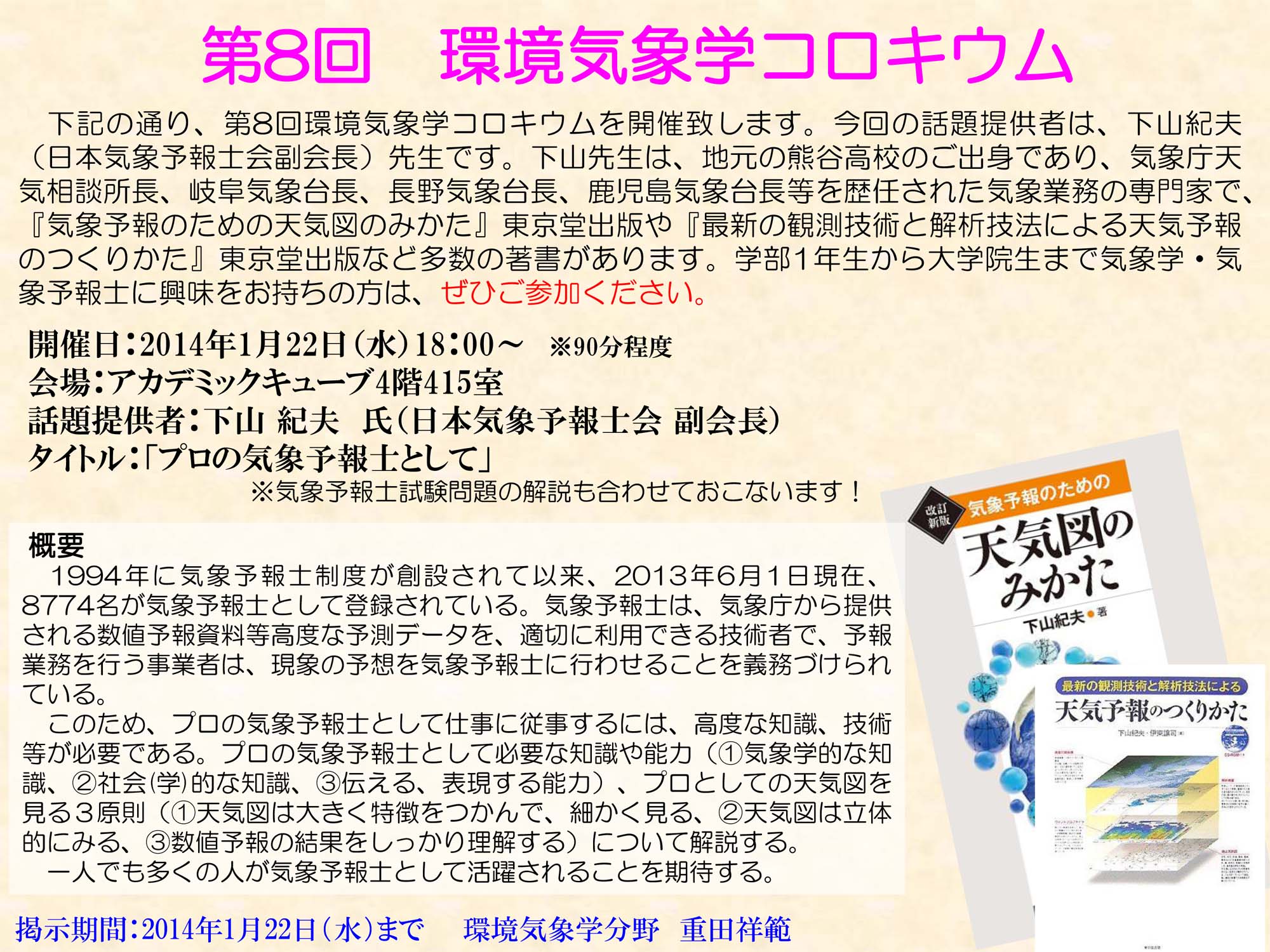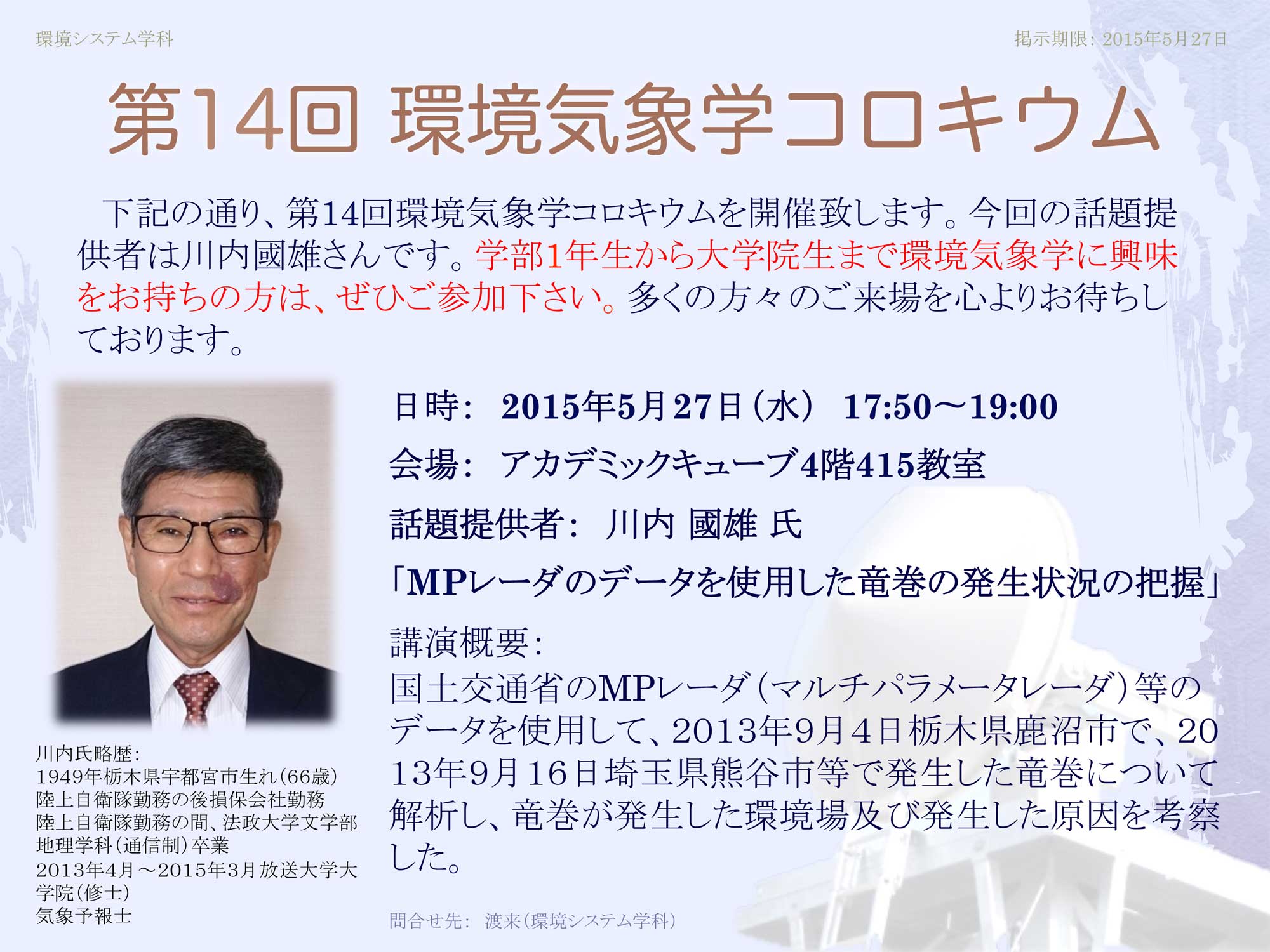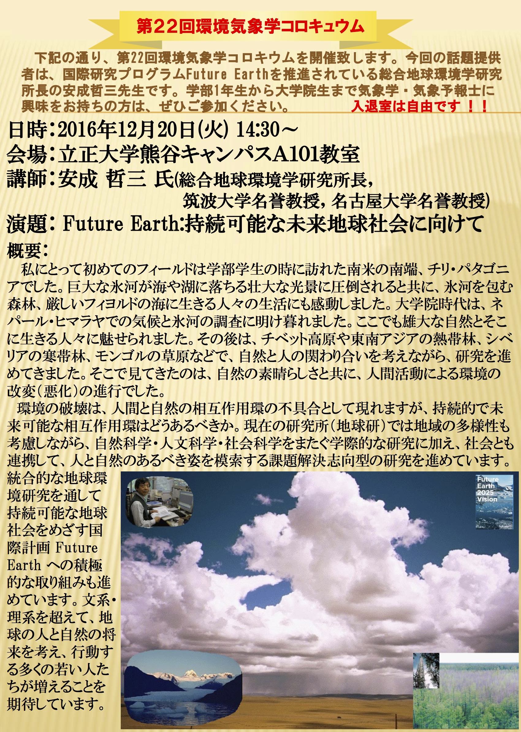 本学地球環境科学研究所(大学院の機関)が、元気象庁長官の二宮氏をお招きして講演会を開催します。本講演会は、第26回環境気象学コロキウムとして共催されます。学部のみなさんも積極的に参加してください。