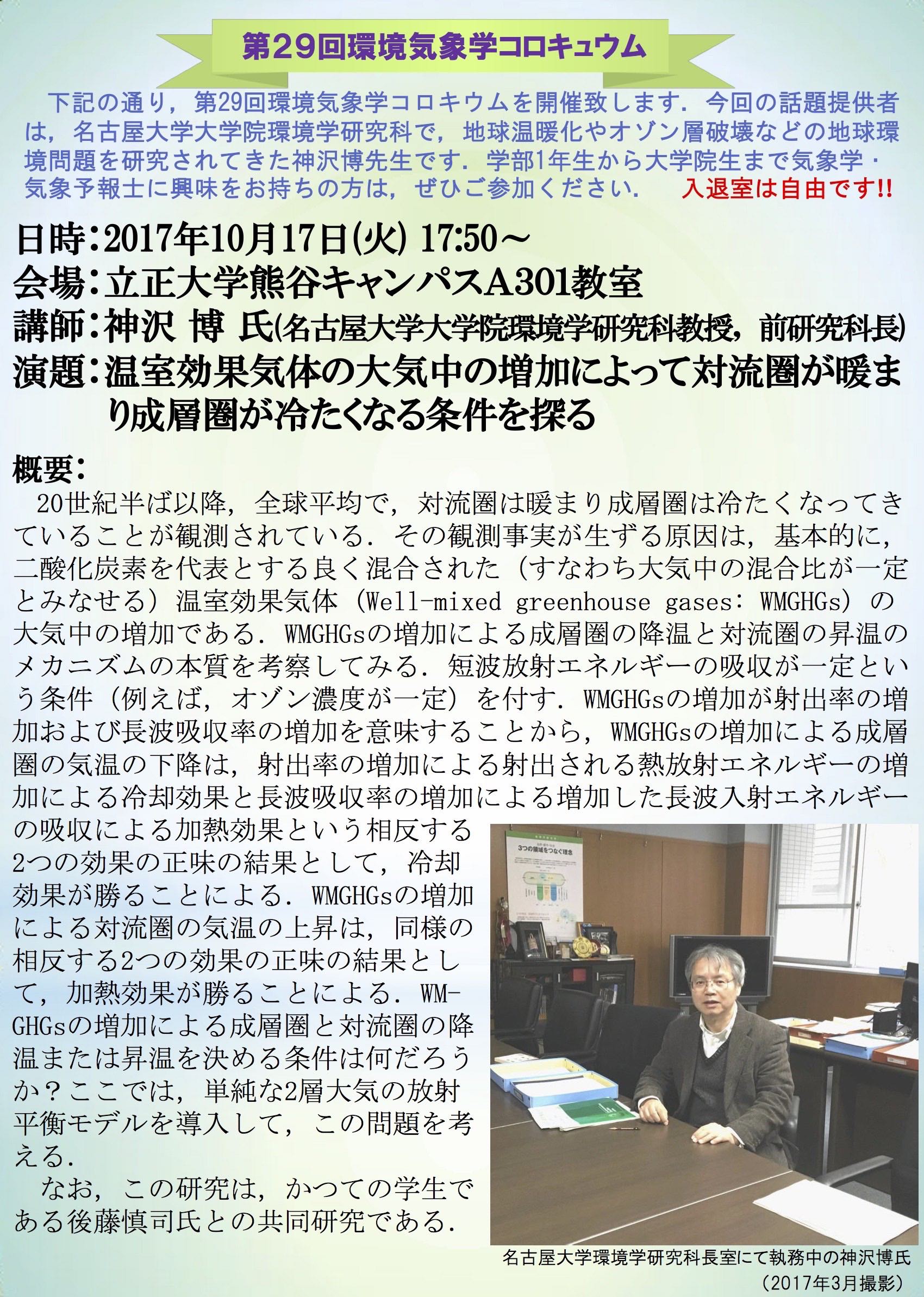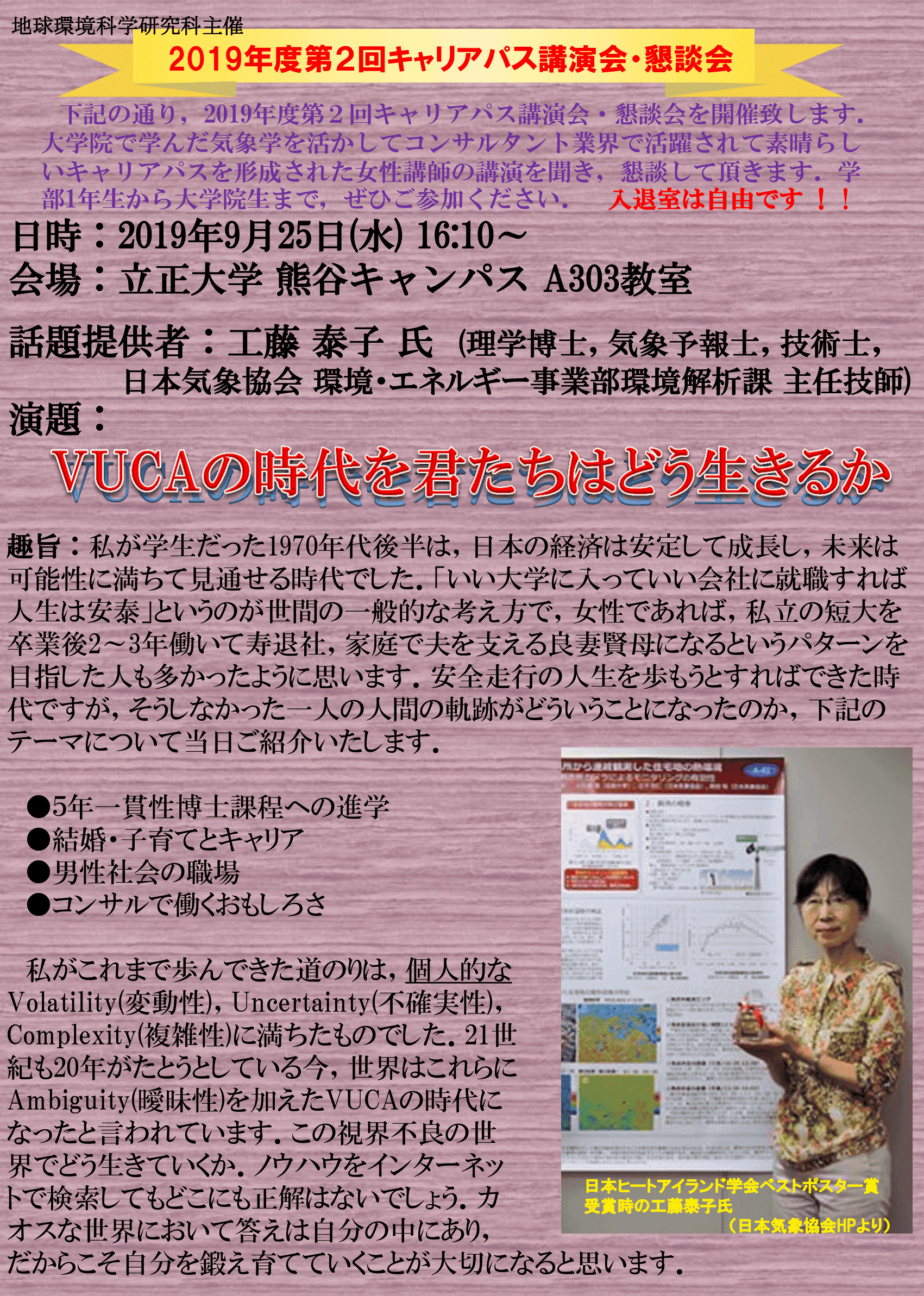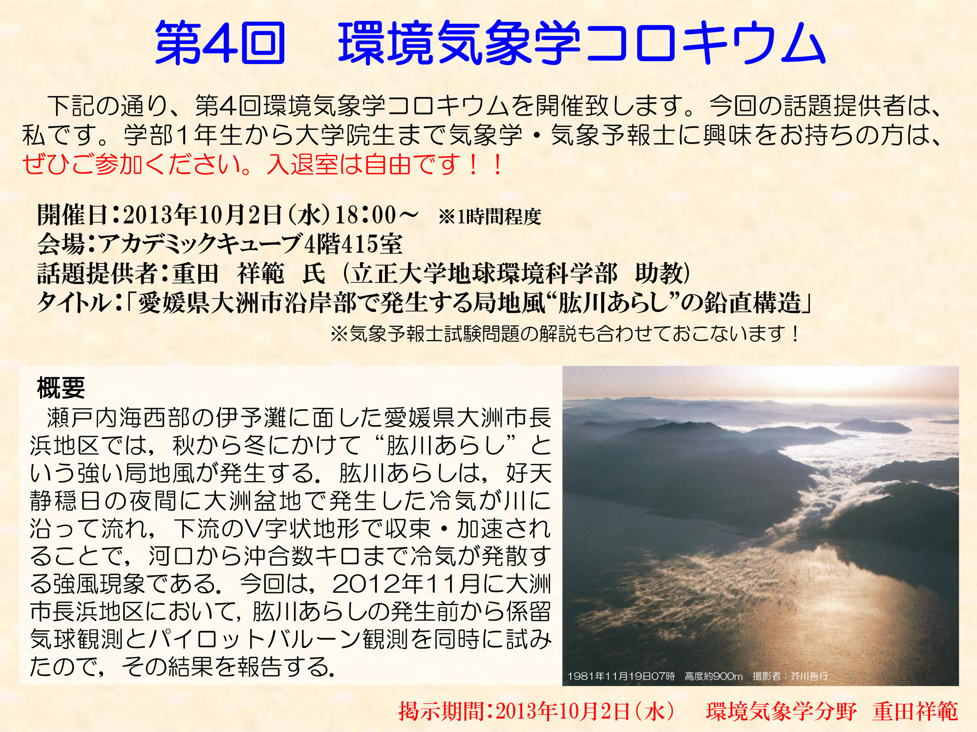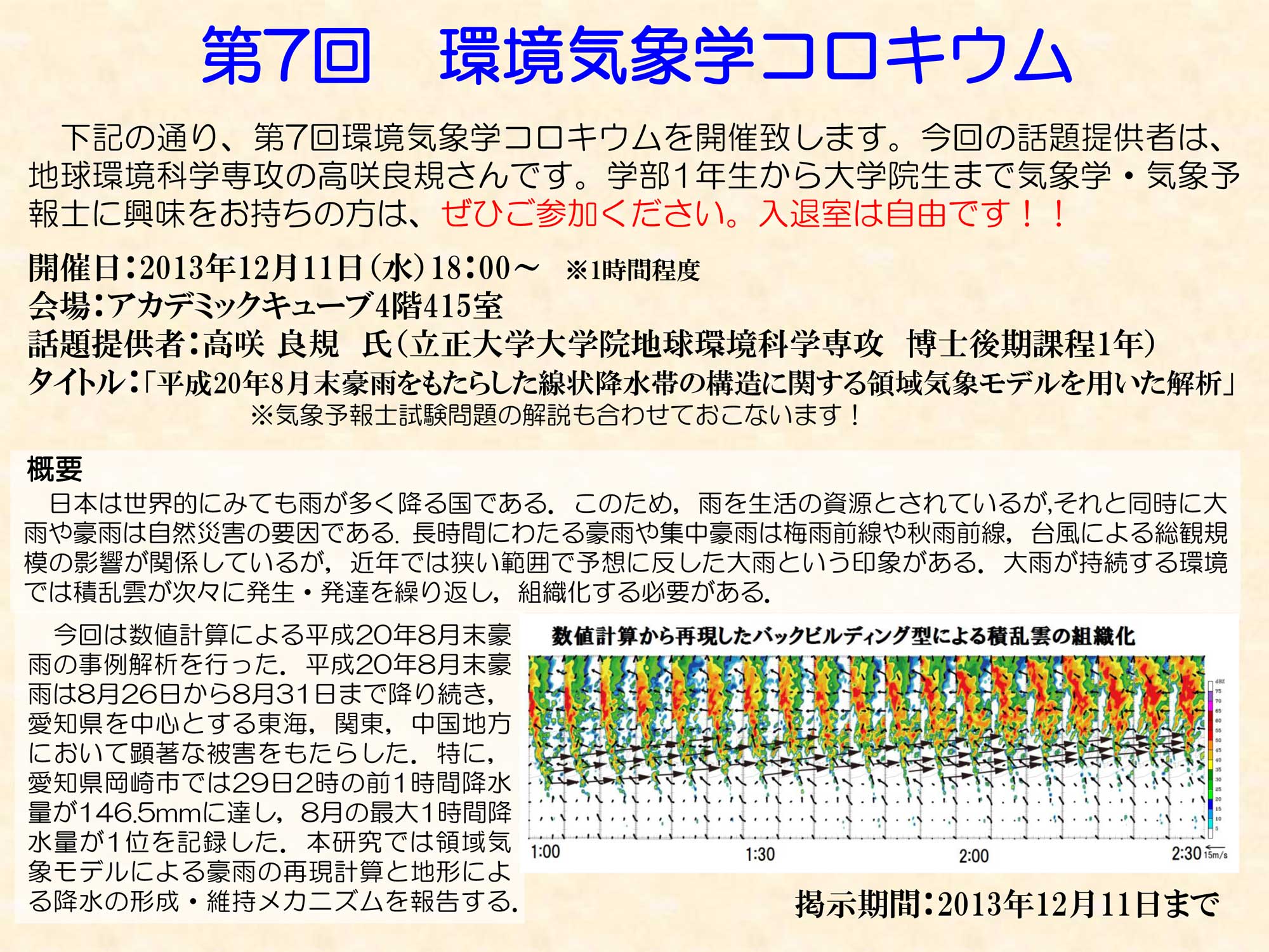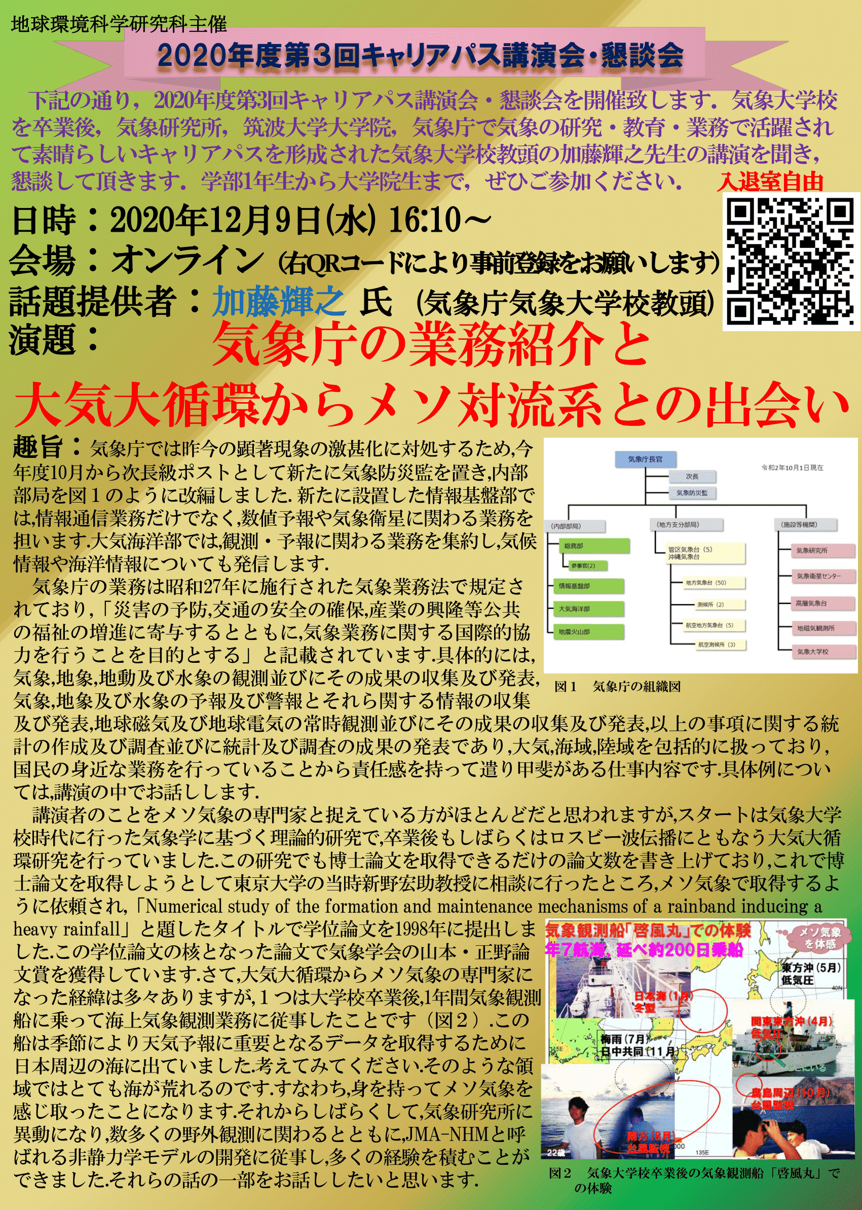 本学地球環境科学研究所(大学院の機関)が、元気象庁長官の二宮氏をお招きして講演会を開催します。本講演会は、第26回環境気象学コロキウムとして共催されます。学部のみなさんも積極的に参加してください。