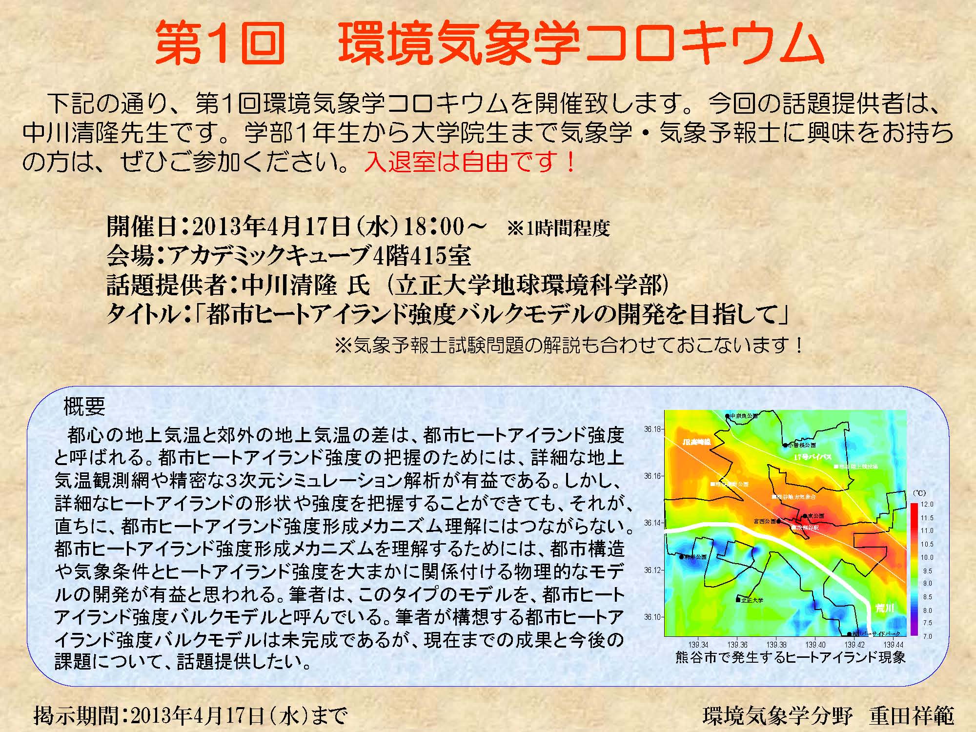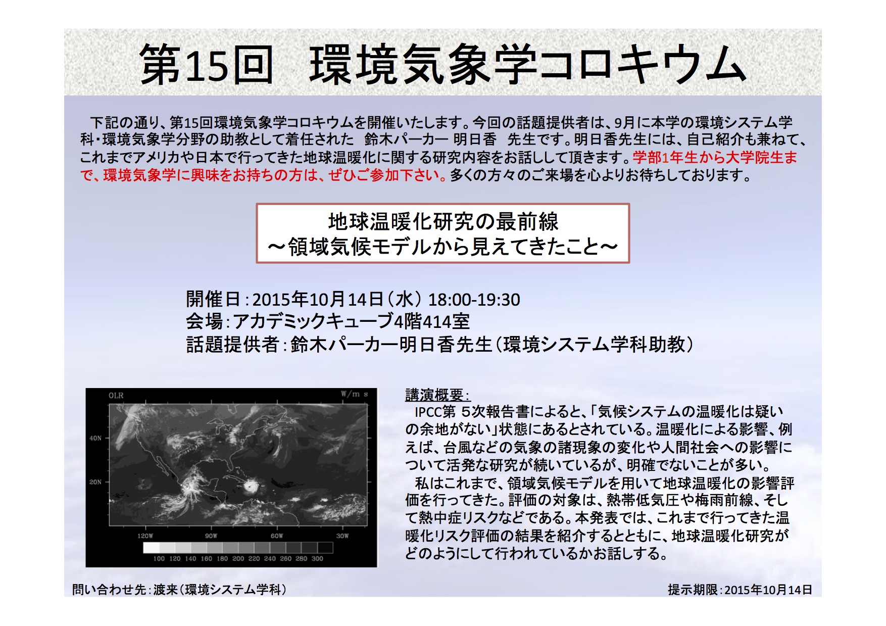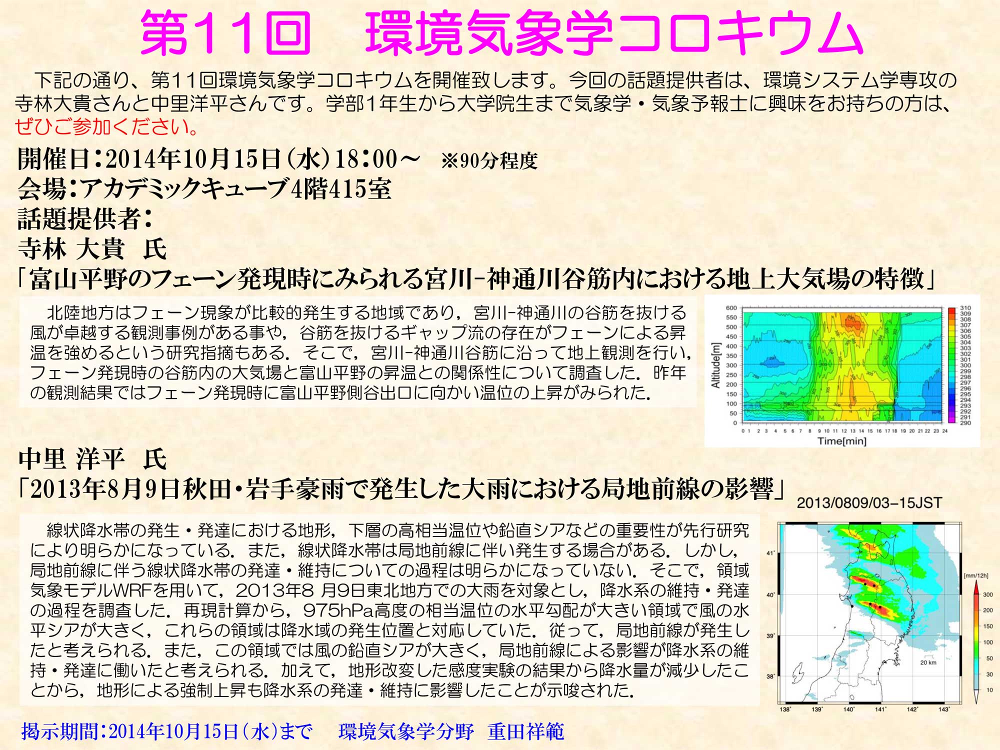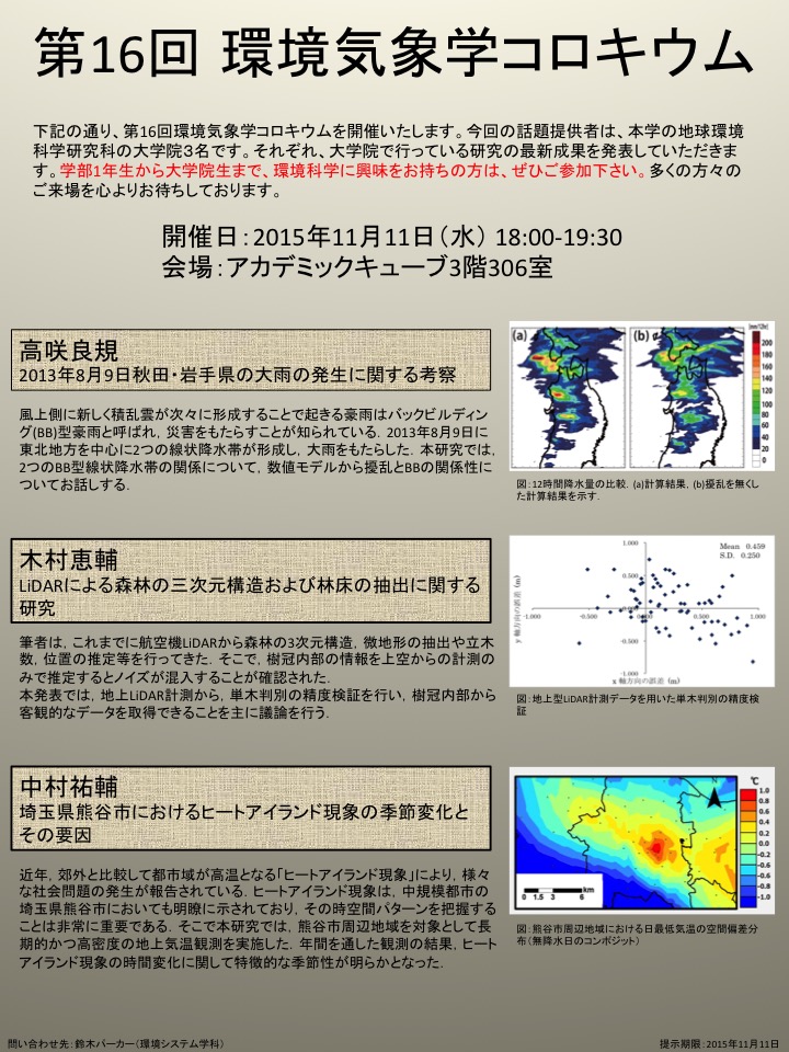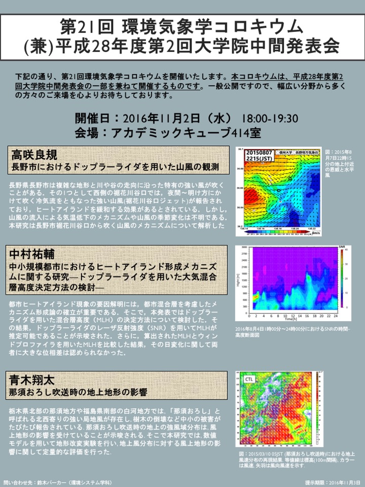 本学環境気象学分野に所属する大学院生3名による発表です。日頃の研究成果を発表していただきます。本コロキウムは、平成28年度第2回大学院中間発表会の一部を兼ねて開催するものです。幅広い分野のみなさんの参加をお待ちしています。
