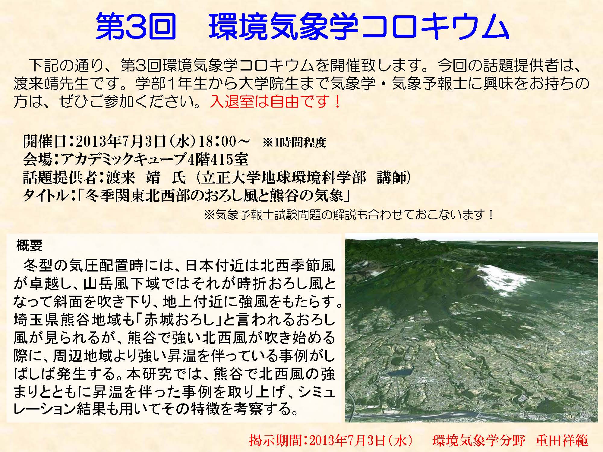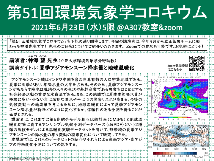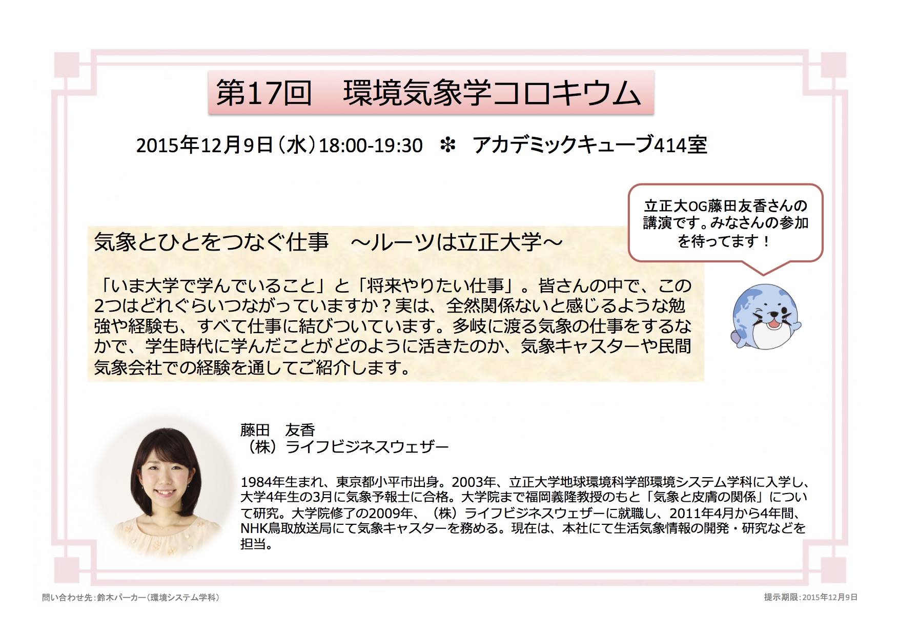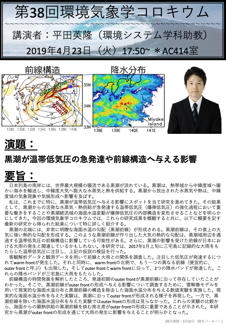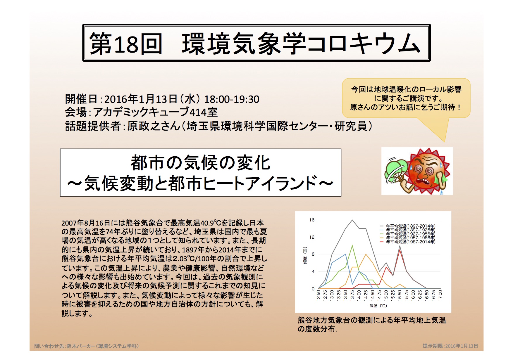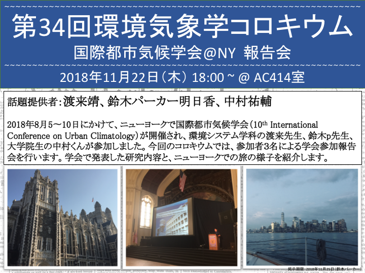 本学環境気象学分野に所属する大学院生3名による発表です。日頃の研究成果を発表していただきます。本コロキウムは、平成28年度第2回大学院中間発表会の一部を兼ねて開催するものです。幅広い分野のみなさんの参加をお待ちしています。