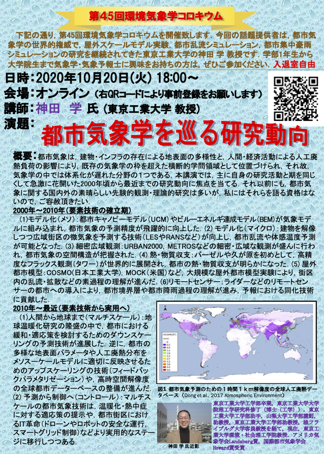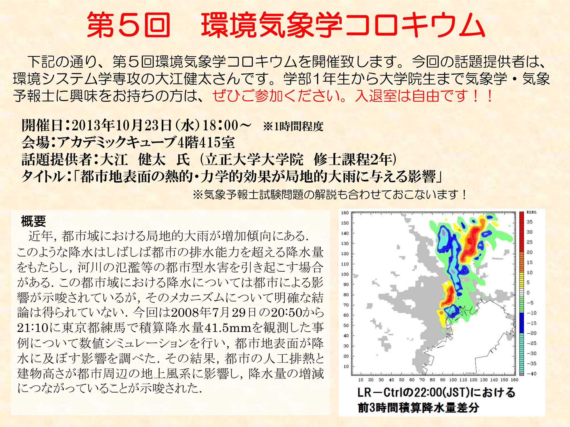 環境気象学コロキウムは、環境気象学に関する最新の研究・トピックスの紹介などの場として、不定期に開催しています。参加は自由です。