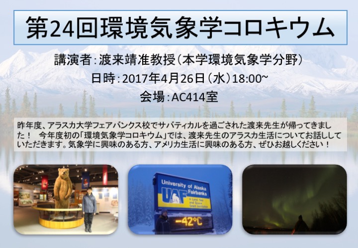 Watarai-sensei is back from a half-year-long sabbatical at the University of Alaska at Fairbanks. Join us for the 24th Environmental Meteorology Colloquium on Apr 26 to discover his experience and discovery up in the "high latitudes"! See you all there!
