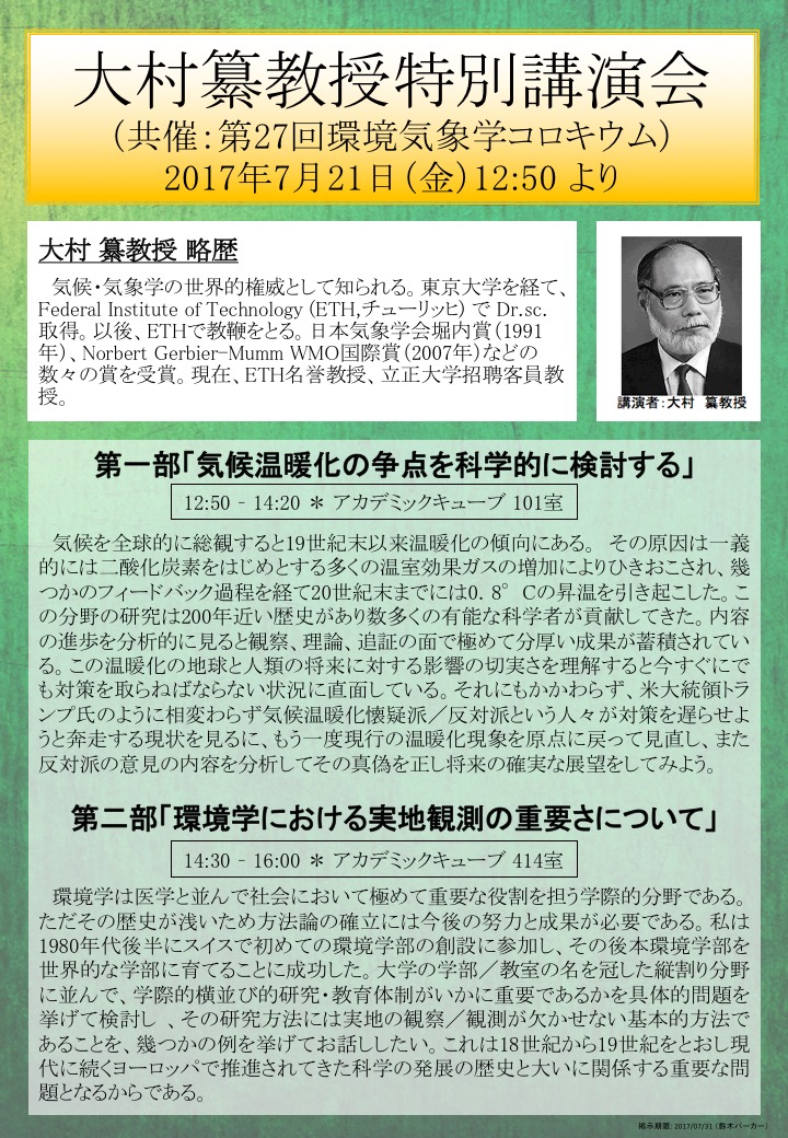 気候・気象学の世界的権威として知られる、大村纂先生の特別講演会が開催されます。東京大学卒業後、ヨーロッパで研究活動を行ってきた方です。特に、ヨーロッパで気象学の中核を担う ETH Zurich(チューリッヒ連邦工科大学)での環境学部の立ち上げを行い、以降は同校で長らく教鞭をとってきました。立正大学では、大村先生を招聘客員教授として度々お招きしていますが、今回は下記の日程で来日し講演会を行ってくださる運びとなりました。名実ともに世界を舞台に活躍されてきた大・大・大先輩の講演会です。ぜひ聴きに来てください!
