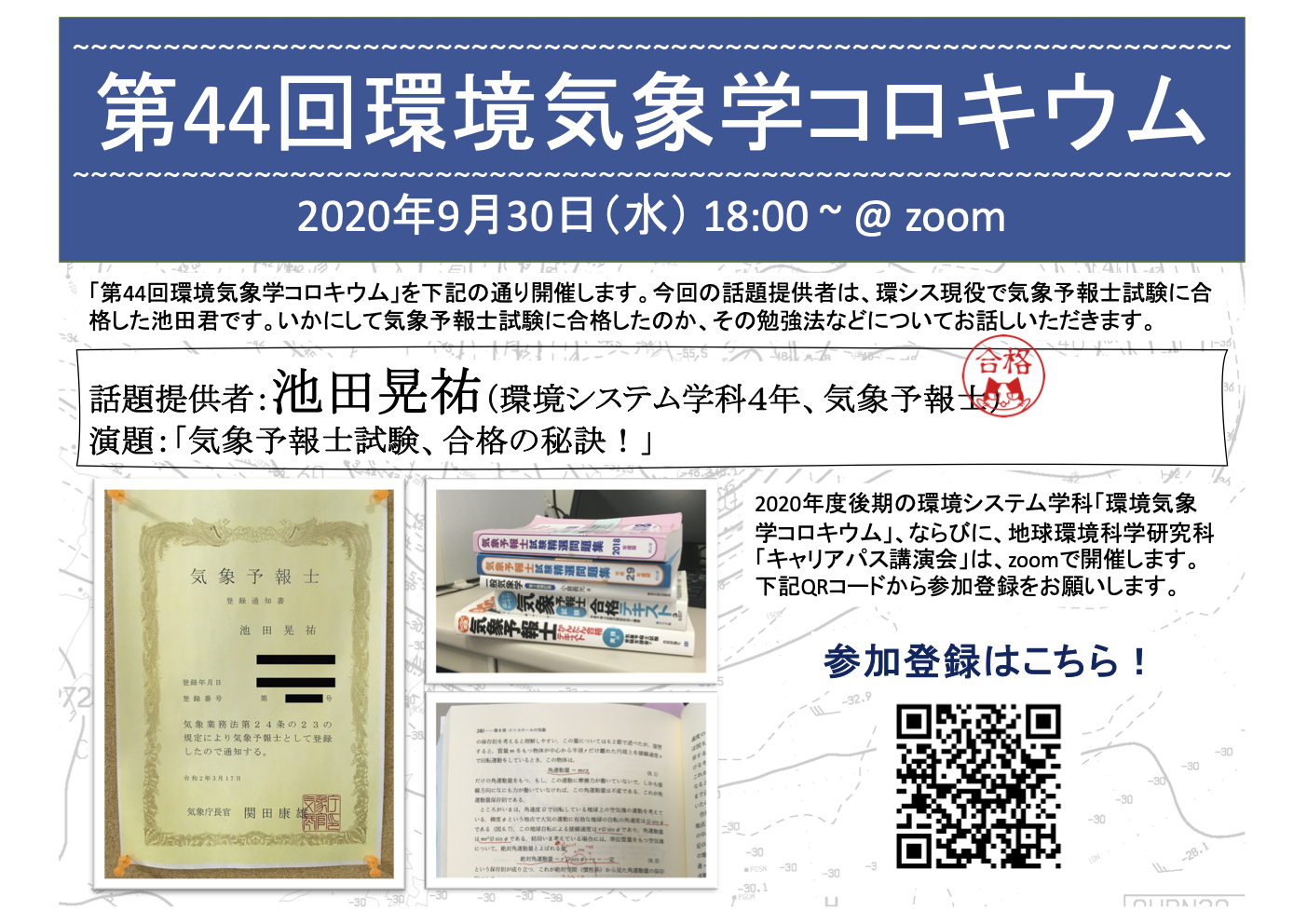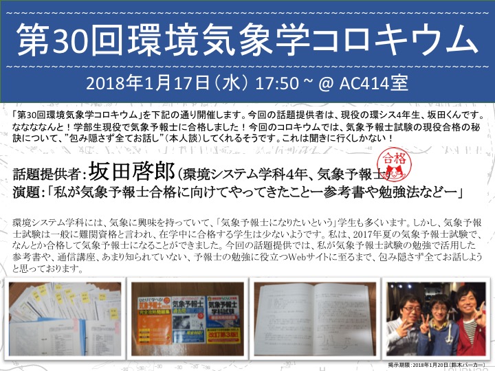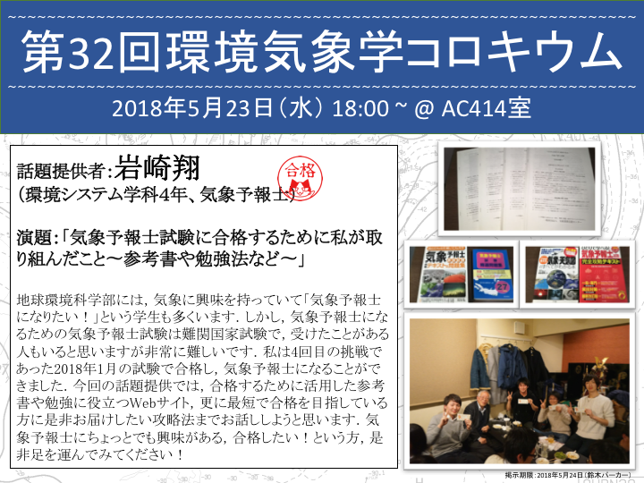 環境システム学科には、気象に興味を持っていて、「気象予報士になりたいという」学生も多くいます。しかし、気象予報士試験は一般に難関資格と言われ、在学中に合格する学生は少ないようです。私は、2017年夏の気象予報士試験で、なんとか合格して気象予報士になることができました。今回の話題提供では、私が気象予報士試験の勉強で活用した参考書や、通信講座、あまり知られていない、予報士の勉強に役立つWebサイトに至るまで、包み隠さず全てお話しようと思っております。