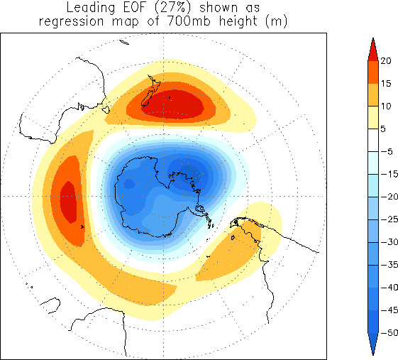 南半球における700hPa等圧面高度偏差場の主成分分析によって得られる寄与率が約30%に達する第1主成分を南極振動と呼ぶ。南極振動は、北極振動と同様に、南極振動指数の値(第1主成分得点)が大きな正の値の時(極渦が強い時)には南極域の気圧が負偏差を示す一方で、中緯度の海上を中心に正偏差を示し、南極振動指数の値が大きな負の値の時には逆のパターンとなる、南極域と中緯度の気圧のほぼ環状のシーソー的変動とされている。