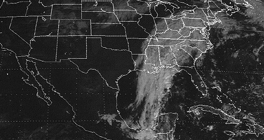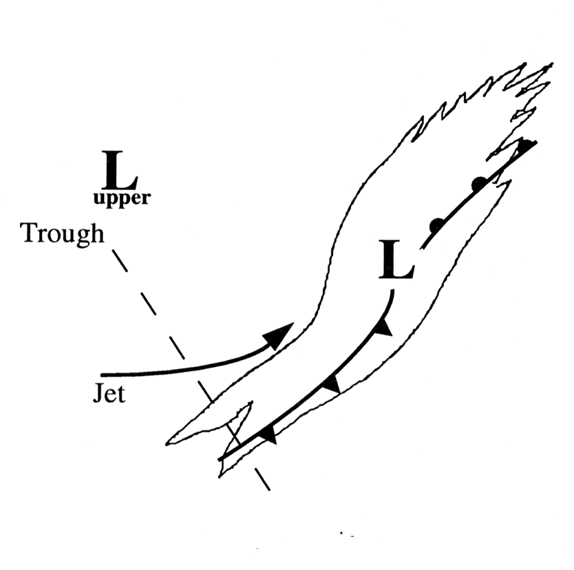 中緯度低気圧の発達過程の初期に、ジェット気流の谷の東側に出現する境界が明瞭な鉛直方向に発達した厚い木の葉状の雲システム。
