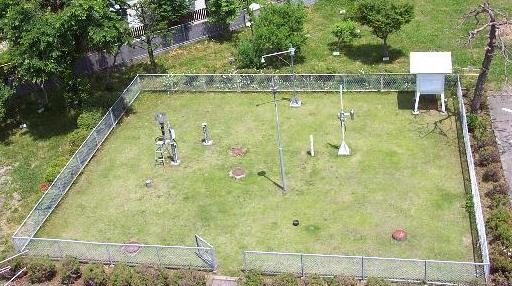 安定した観測環境を維持するため、周囲にある人工物の影響を受けないよう配慮して選んで、温度計、雨量計、湿度計、日射日照計などの観測装置が設置されている一辺の長さが20m以上で、約600u以上のできるだけ広がりのある芝生で覆われた場所。下の写真は、気象庁高山測候所の露場全景。 (http://www.gifu-net.ed.jp/kishou/takayama/index.htmより)
